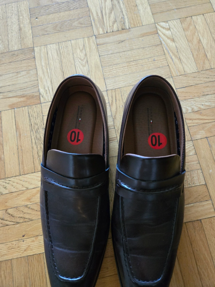 Here are some Tommy Hilfiger loafers in a dark brown leather. They are a size 10. They show some signs of wear on the soles, but overall they are in good condition and ready for a new home! worn once