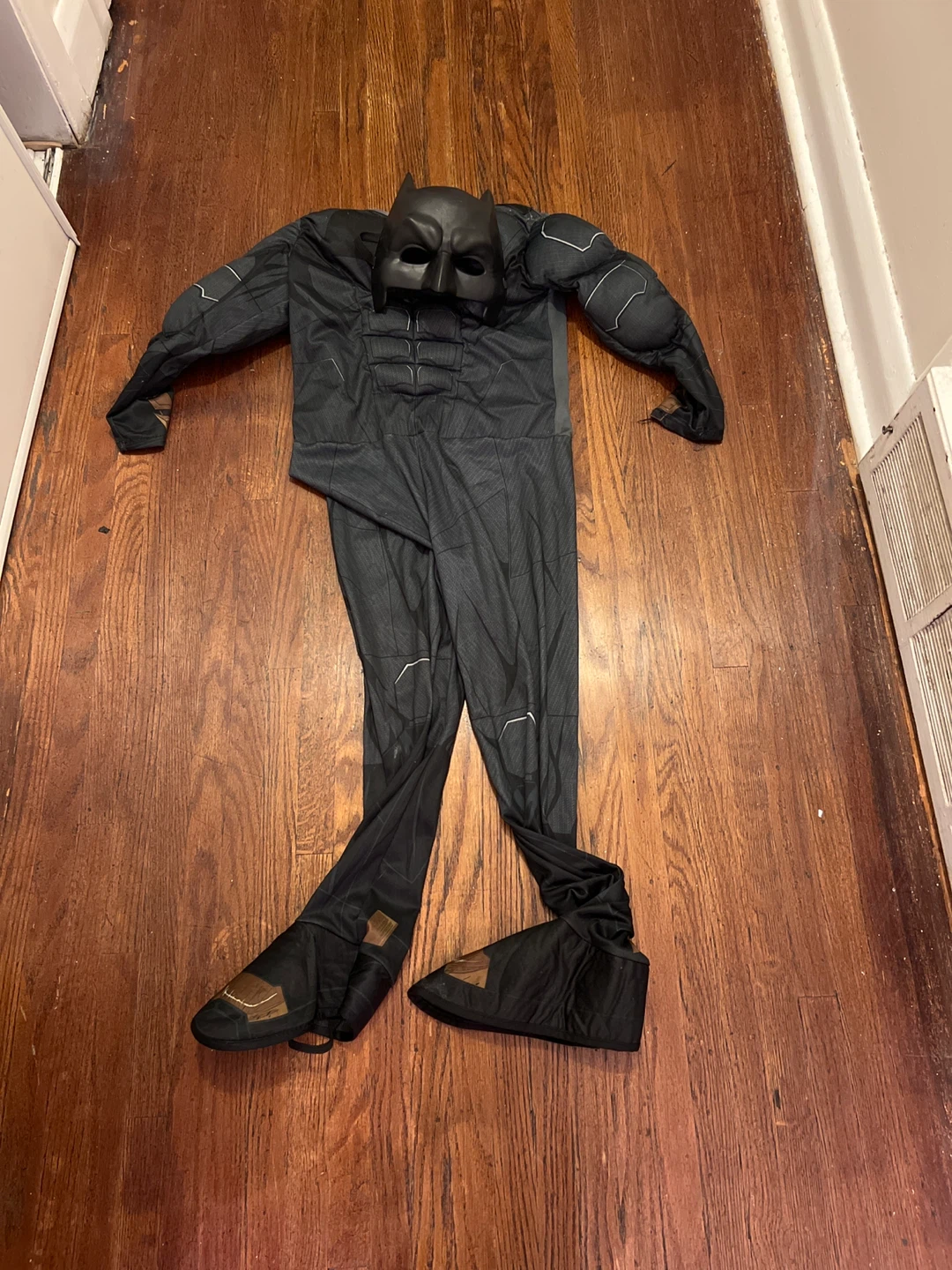 Selling a Batman costume! It includes the mask and the full body suit with shoe covers. Great for Halloween or dress up!