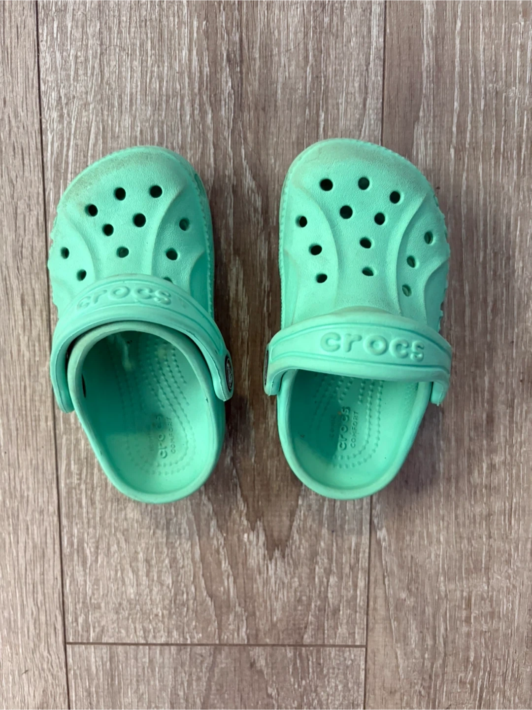 Selling a pair of kids Crocs in a lovely light green colour! They are in good condition and perfect for your little one. The size is a kids' 6.