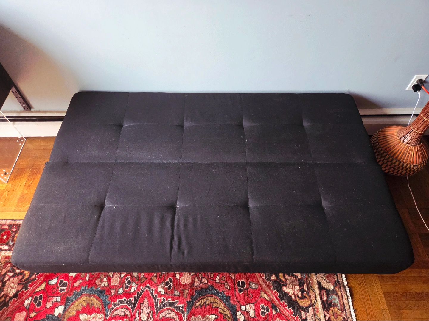 Ikea Balkarp three seater tufted sleeper sofa in tufted charcoal fabric.