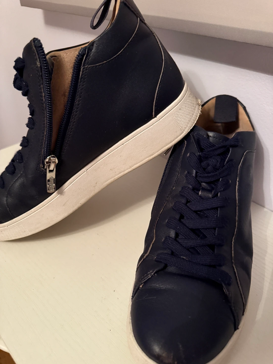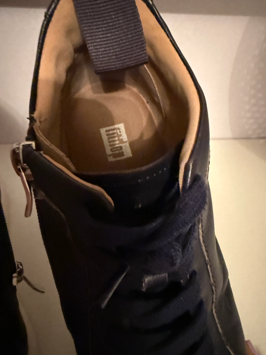 These are a pair of navy blue high top sneakers from fitflop! They feature a zipper on the side and laces in the front. They have a white sole.