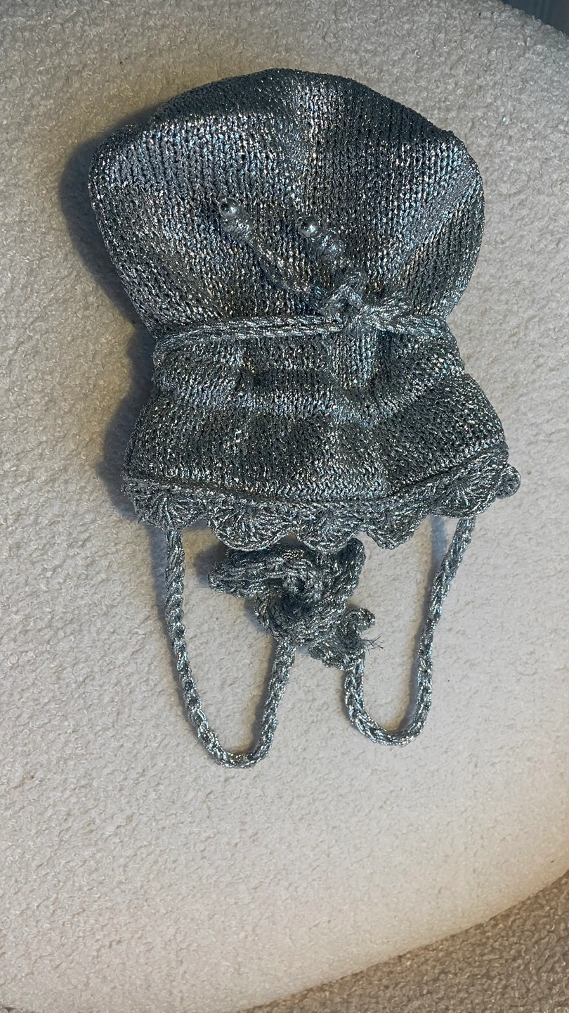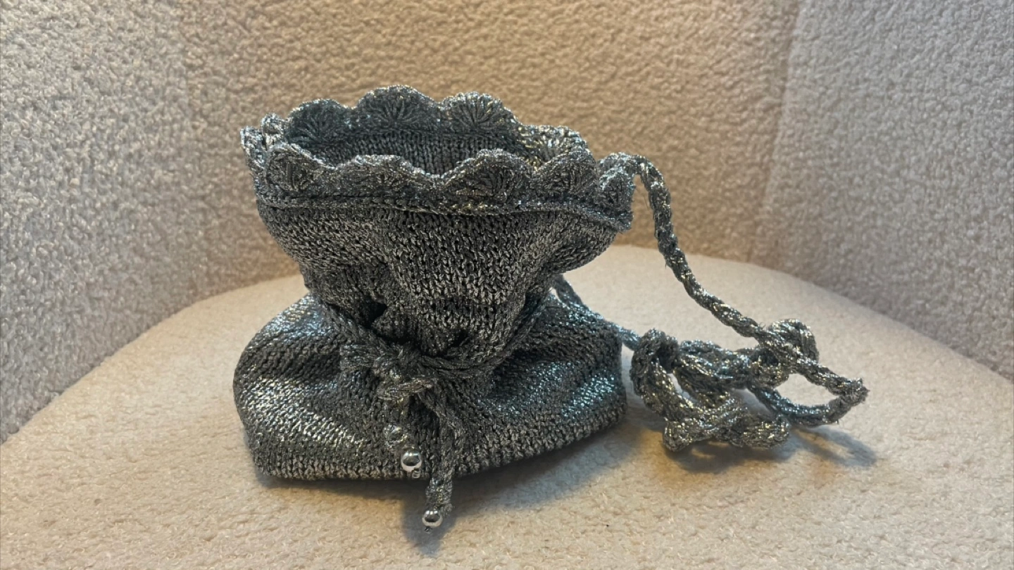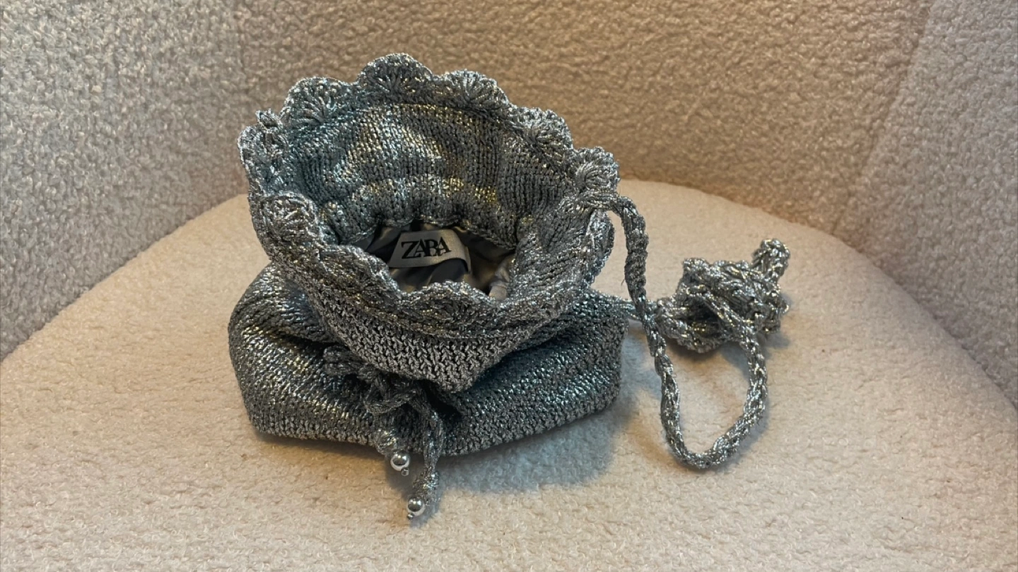 This Zara mini bucket bag is perfect for adding a touch of sparkle to any outfit! It features a metallic silver finish and a drawstring closure.