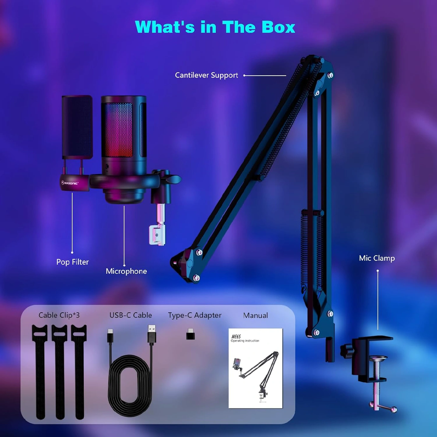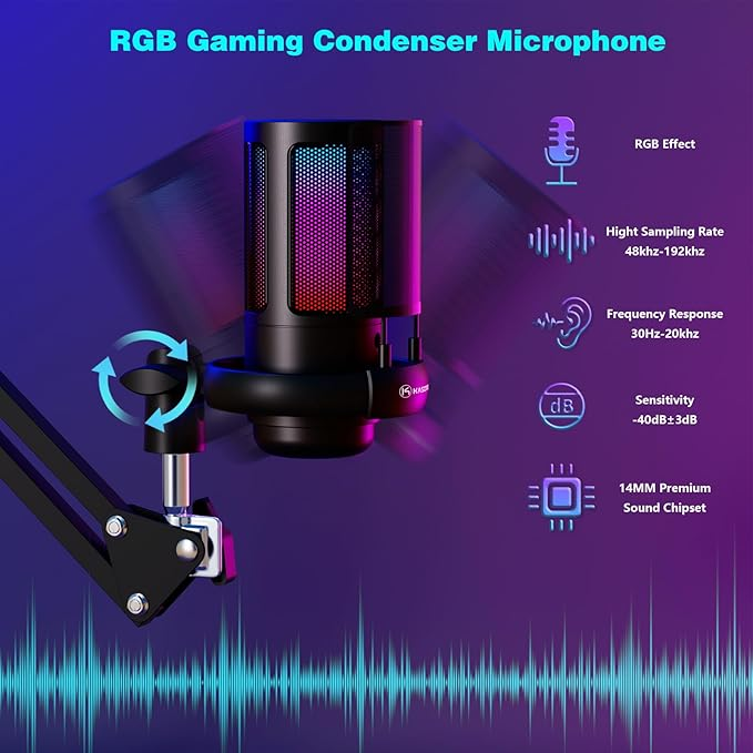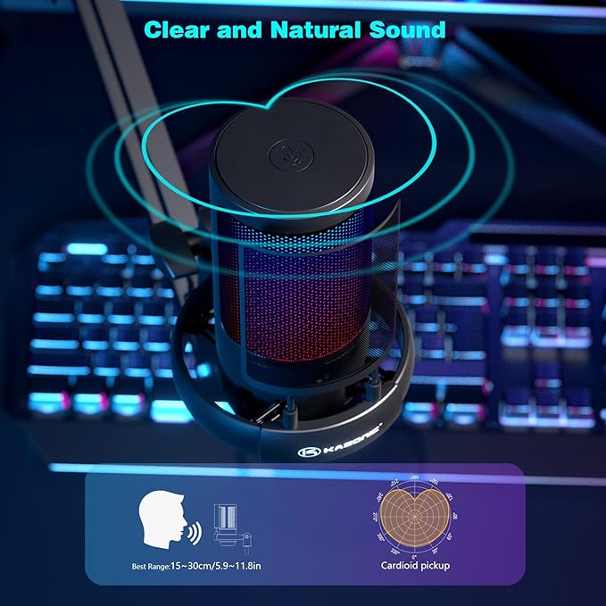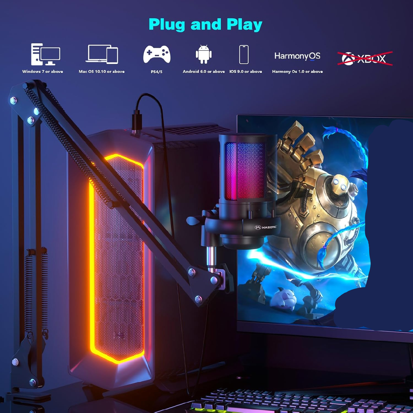 Selling a Kasonic RGB gaming condenser microphone. It features a touch-sensitive mute button and zero-latency monitoring. It has a high sampling rate of 48kHz-192kHz and a frequency response of 30Hz-20kHz. Also features mic gain control, and a 14mm premium sound chipset. It supports Windows 7 or above, Mac OS 10.10 or above, PS4/5, Android 6.0 or above, iOS 9.0 or above, HarmonyOS 1.0 or above.