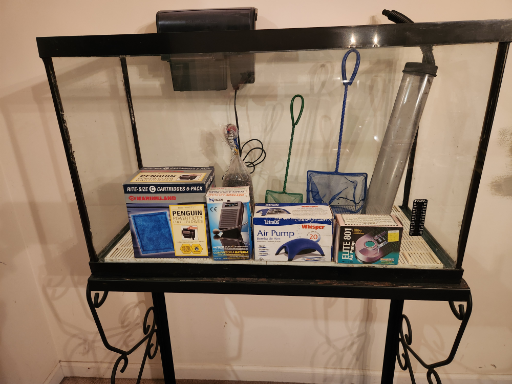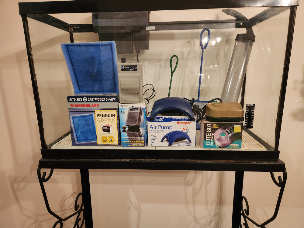 Selling a fish tank that comes with a stand and various accessories! It includes a filter, air pump, ( 2) nets, and other items you see in the pictures. Great setup for anyone looking to start or upgrade their aquarium