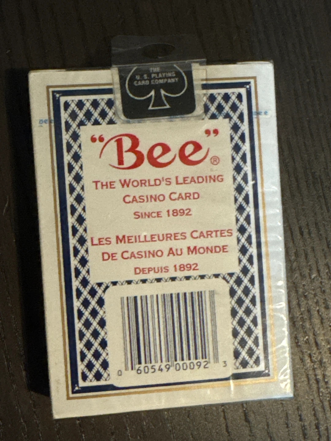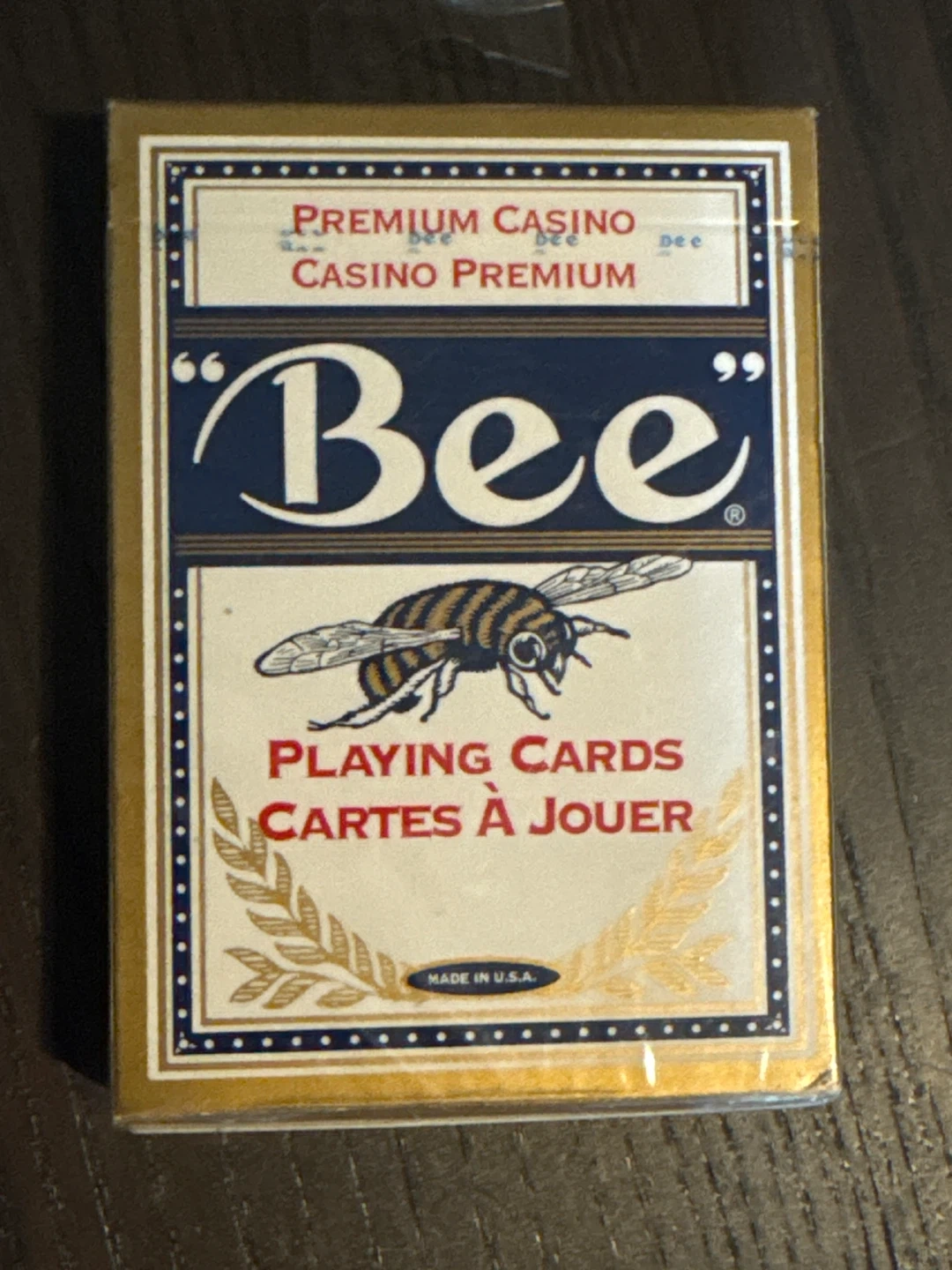 I have a new deck of Bee Premium Casino playing cards for sale! These cards are known for their quality and durability, making them perfect for poker night or any card game. They are still sealed in their original packaging!