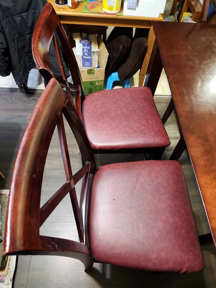 Includes 4 clean leather solid wood chairs. From floor to seat is 25" (64cm) height and from floor to top is 42.5" (108cm) height.