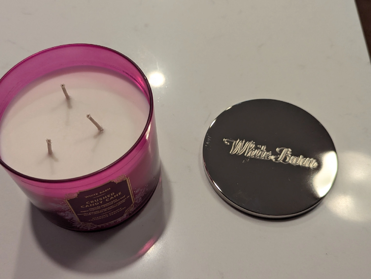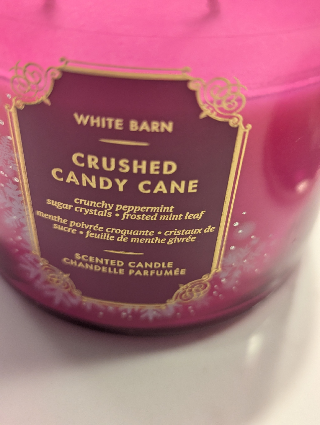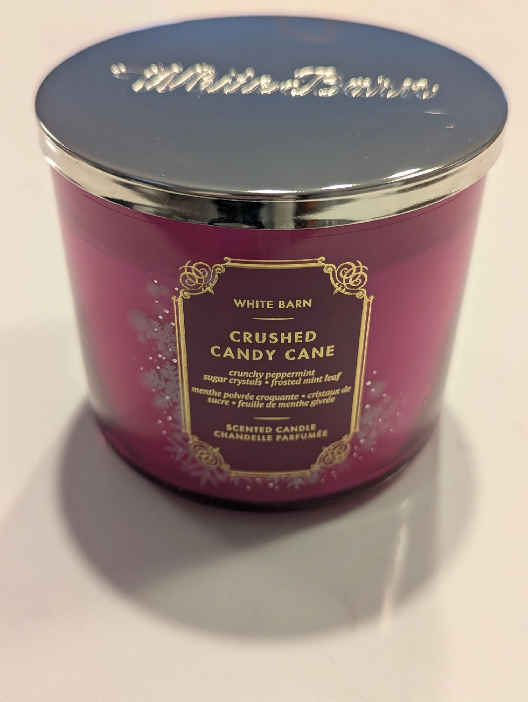 Selling a White Barn Crushed Candy Cane scented candle. It's a beautiful candle with a lovely scent of crunchy peppermint, sugar crystals and frosted mint leaf. Perfect for the holidays!