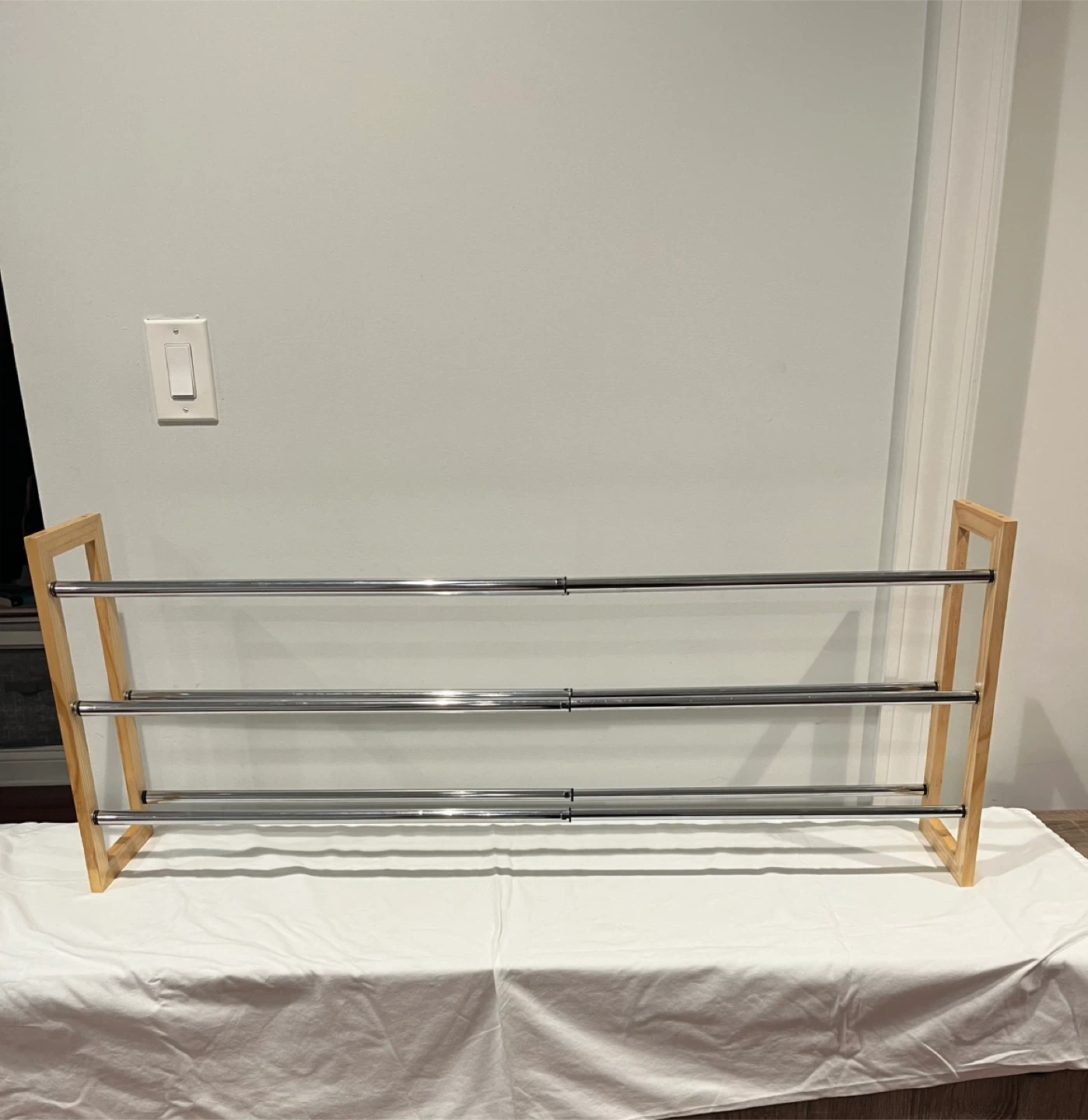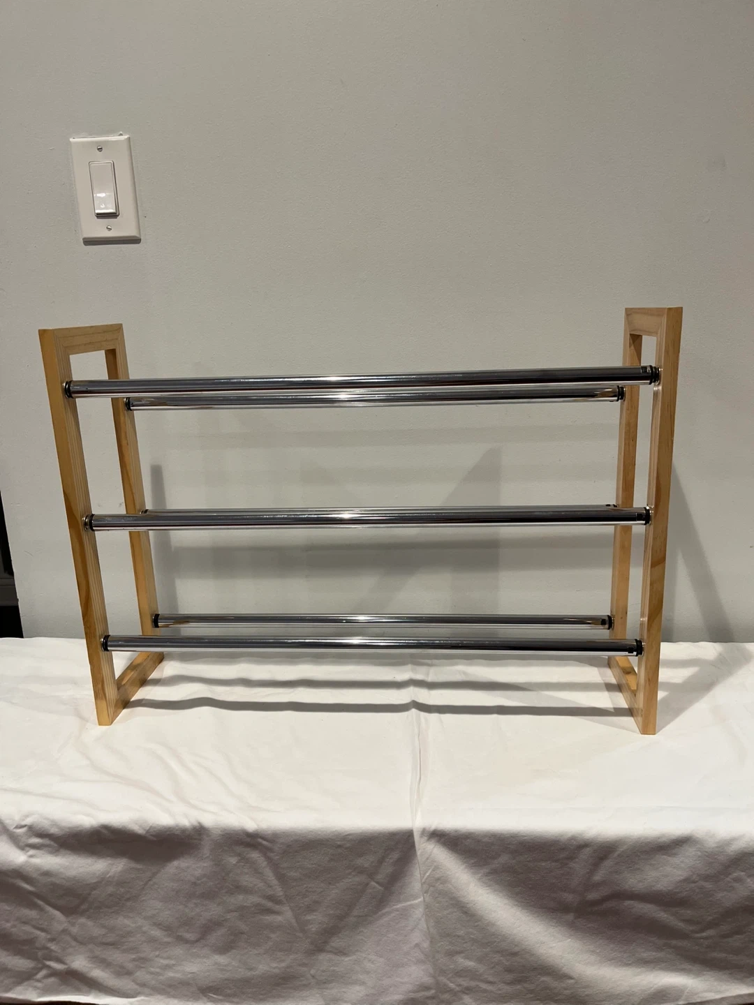 Selling a 3-tier shoe rack with a light wood frame and metal bars. It's in great condition and perfect for keeping your entryway or closet organized