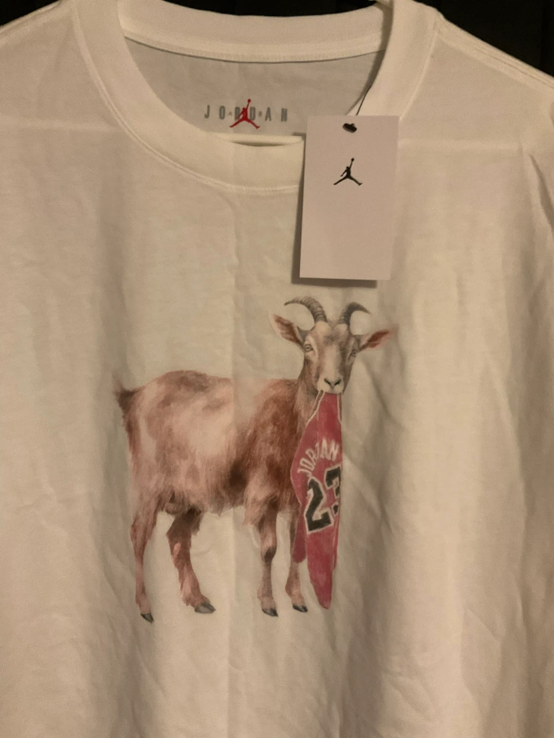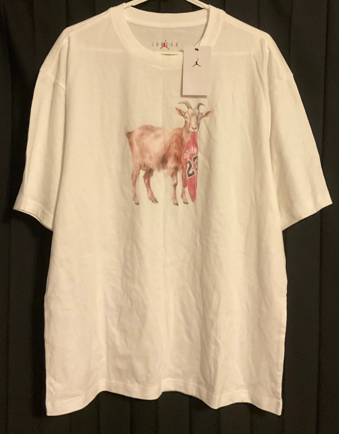 Selling a Jordan white t-shirt in size large! It features the Jordan logo and a goat graphic on the front. The shirt is BRAND NEW and ready to wear