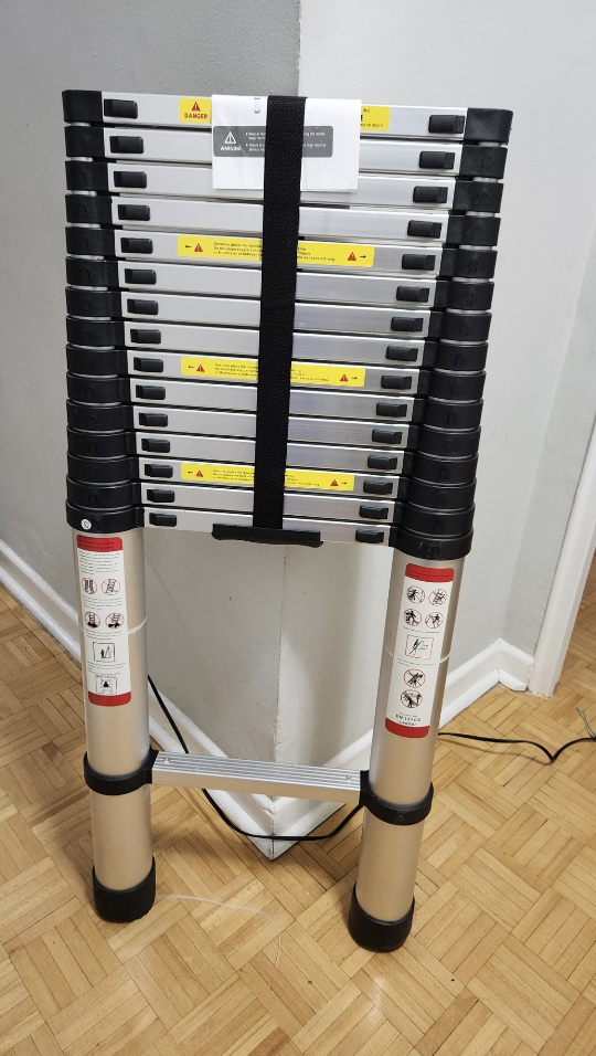 It's never been used and is still sealed. It is made of aluminum alloy, weighs ~16kg and the load capacity is 330 lbs. Rungs are slip-resistant and have self-locking feature. Don't ask for a lower price please, original price is $346.