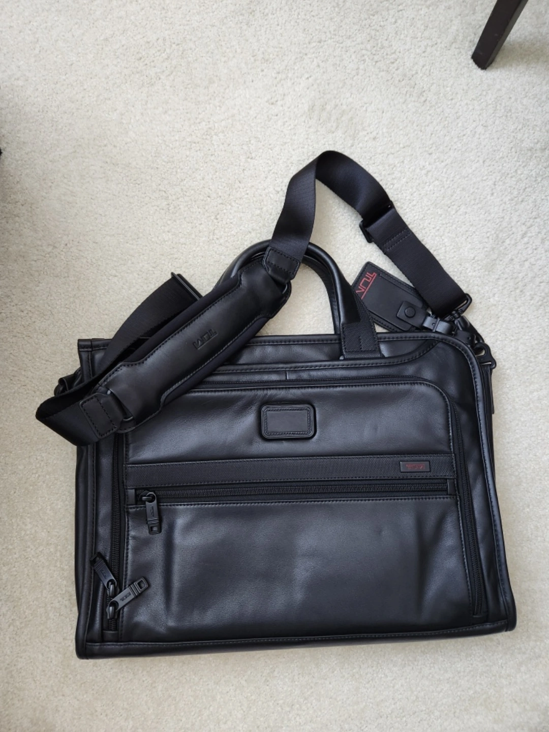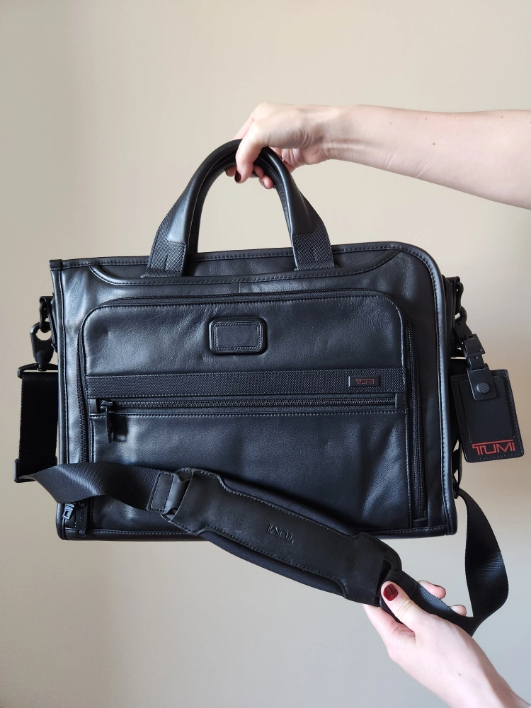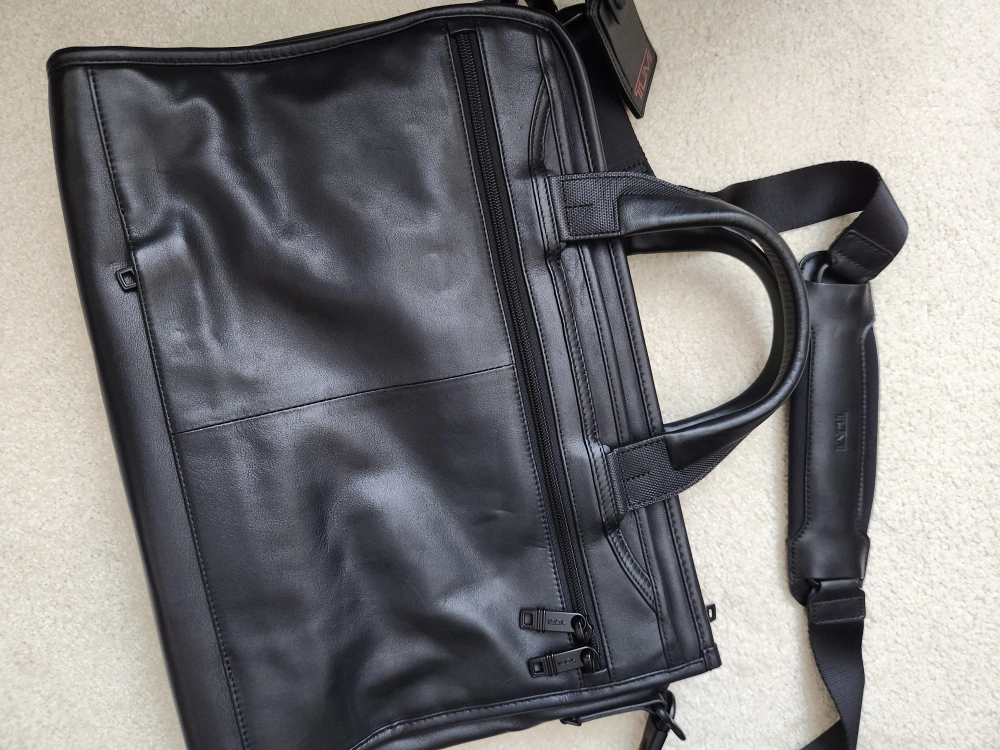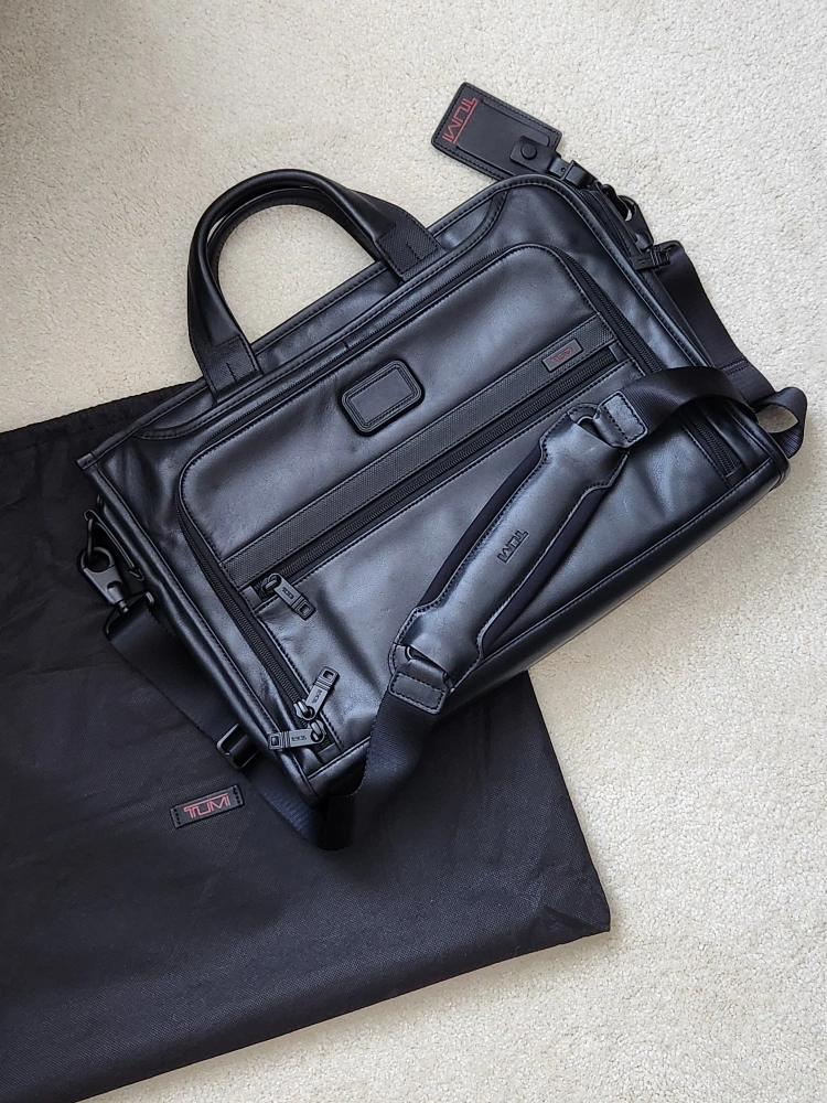 Selling practically brand new Tumi leather bag (discontinued model: Tumi Alpha 2 Slim Deluxe Portfolio). This was gifted but forgotten for years so in brand new condition with dust bag and strap.
