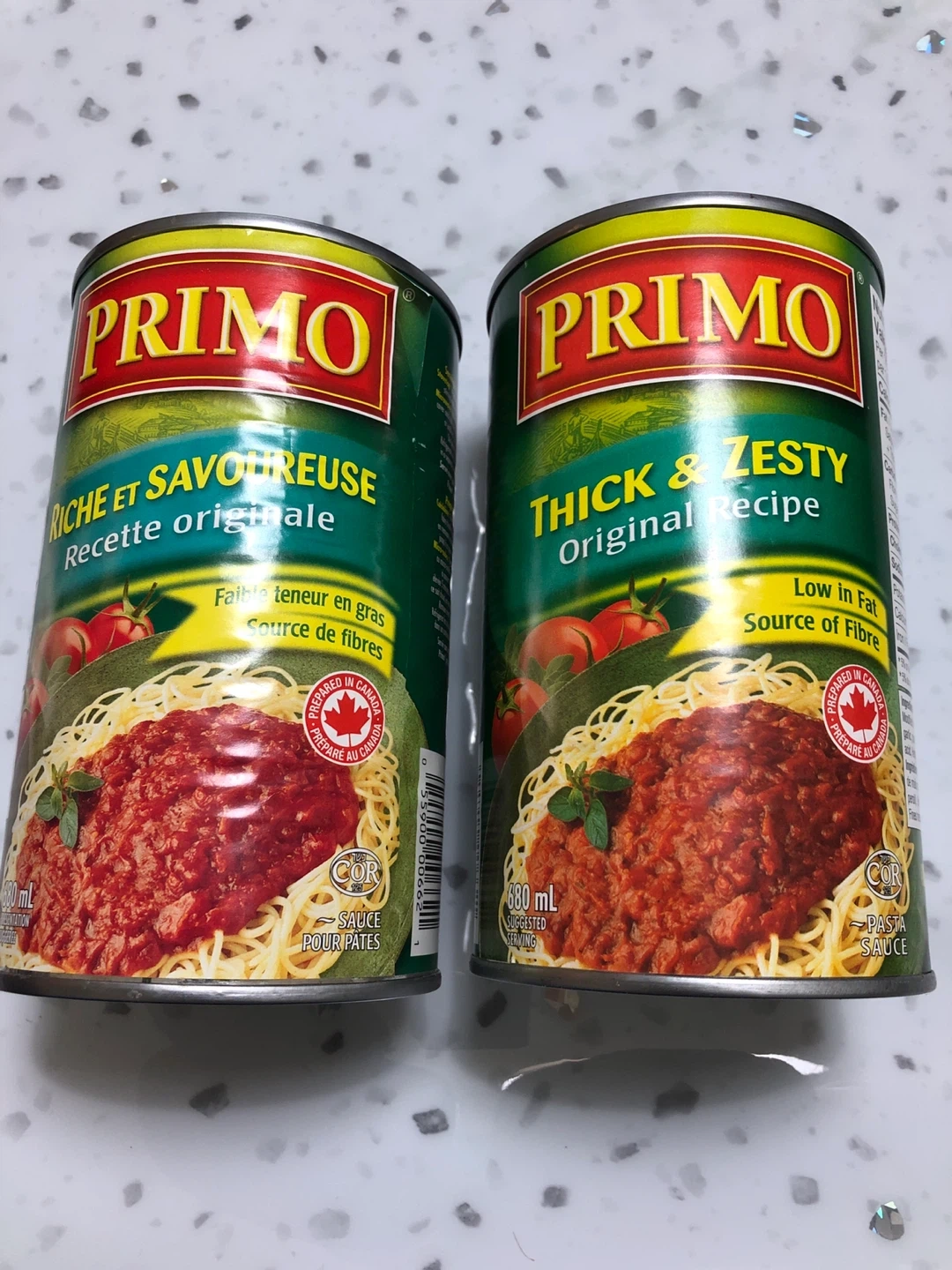 Two cans of Primo pasta sauce for sale! One is Riche et Savoureuse (Original Recipe) and the other is Thick & Zesty (Original Recipe). Both are 680 mL.
