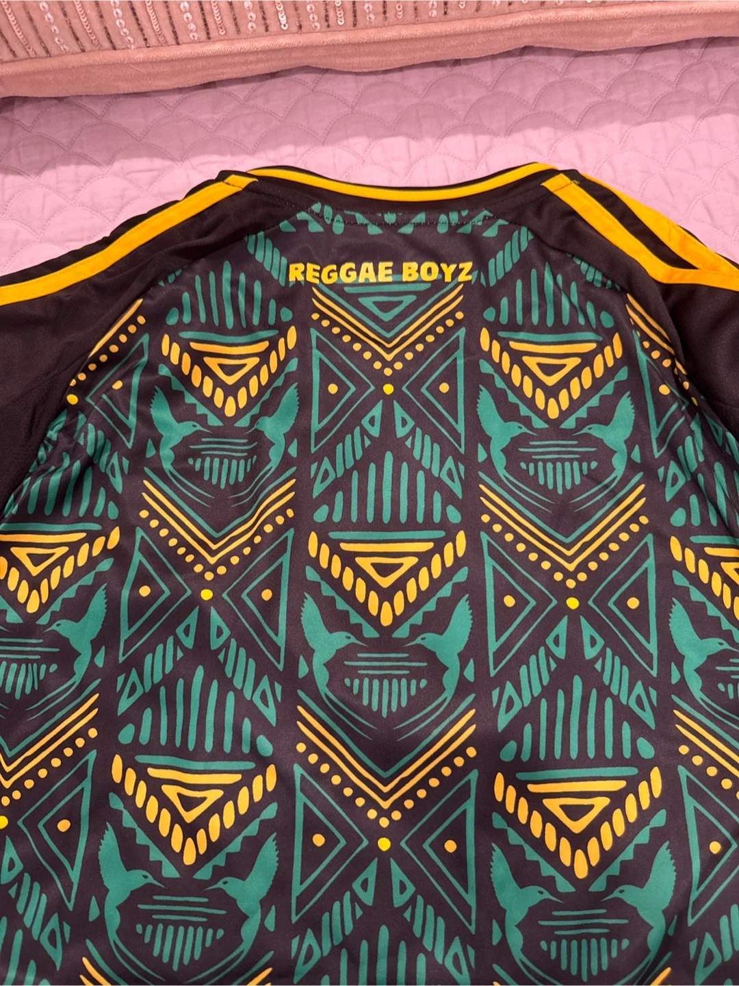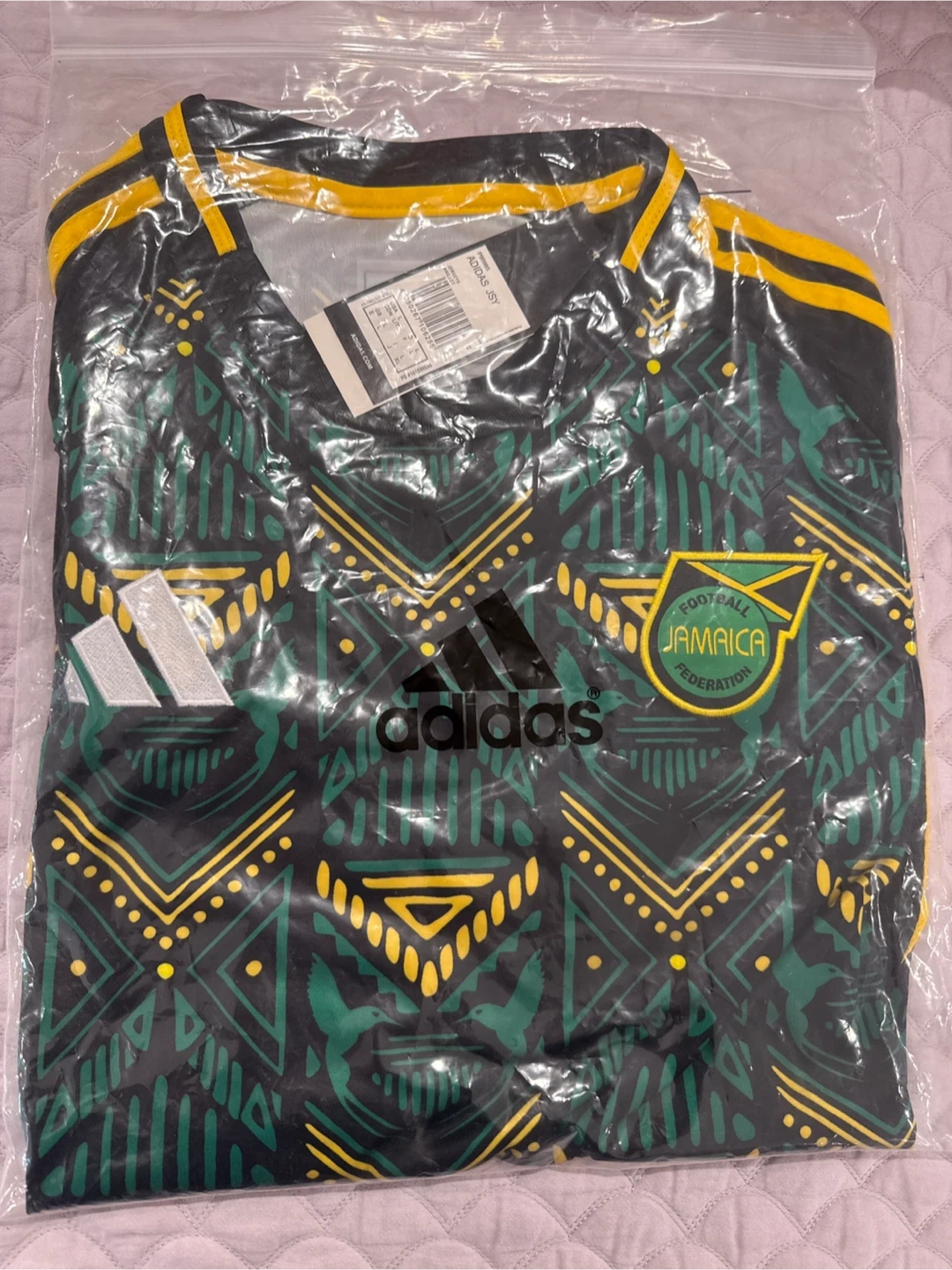 Selling a brand new with tags Adidas Jamaica 2024 Reggae Boyz jersey in size L. It's a sharp looking jersey with the Football Jamaica Federation logo and Adidas logo. The jersey is black with green and yellow accents. The back has 'REGGAE BOYZ' printed on it. It is an Adidas JSY (jersey).