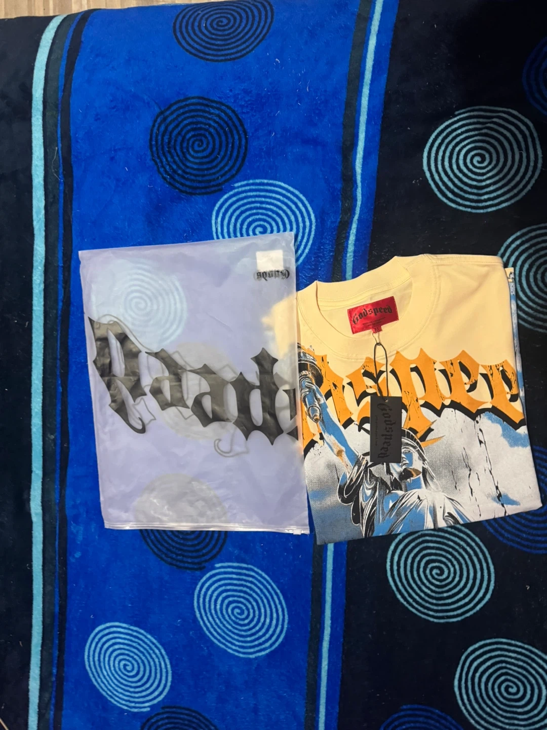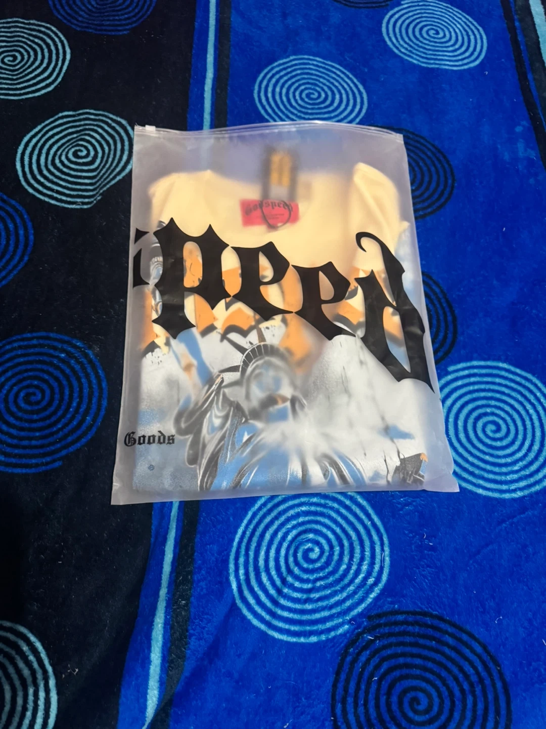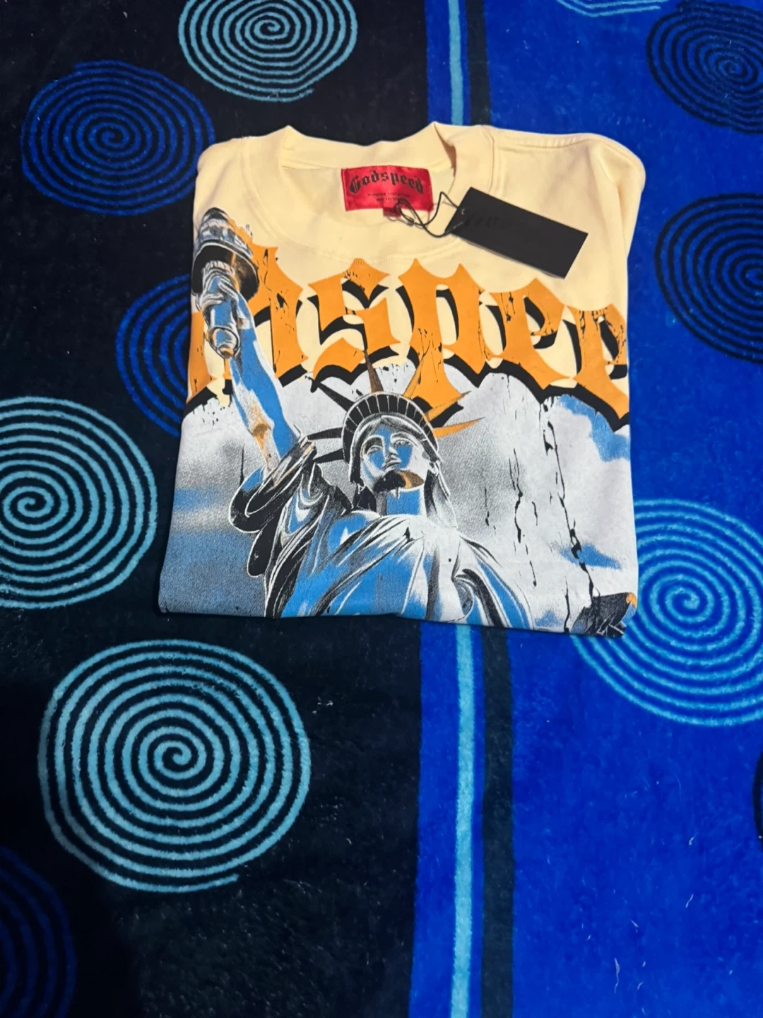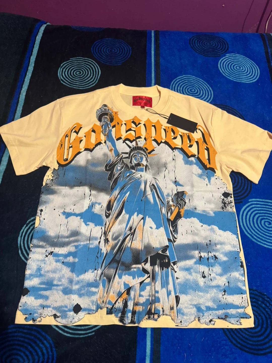 Selling a Godspeed T-shirt with the Statue of Liberty design. The shirt has a unique graphic on the front and the back says 'Manifested in MMXIII'. It's in new condition and comes in its original packaging