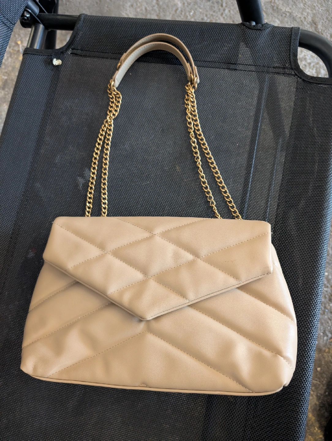 Selling a beige quilted shoulder bag from H&M! It's in great condition and perfect for everyday use or a night out. The bag features a gold chain strap and a quilted design. It's a stylish and versatile accessory to add to your wardrobe