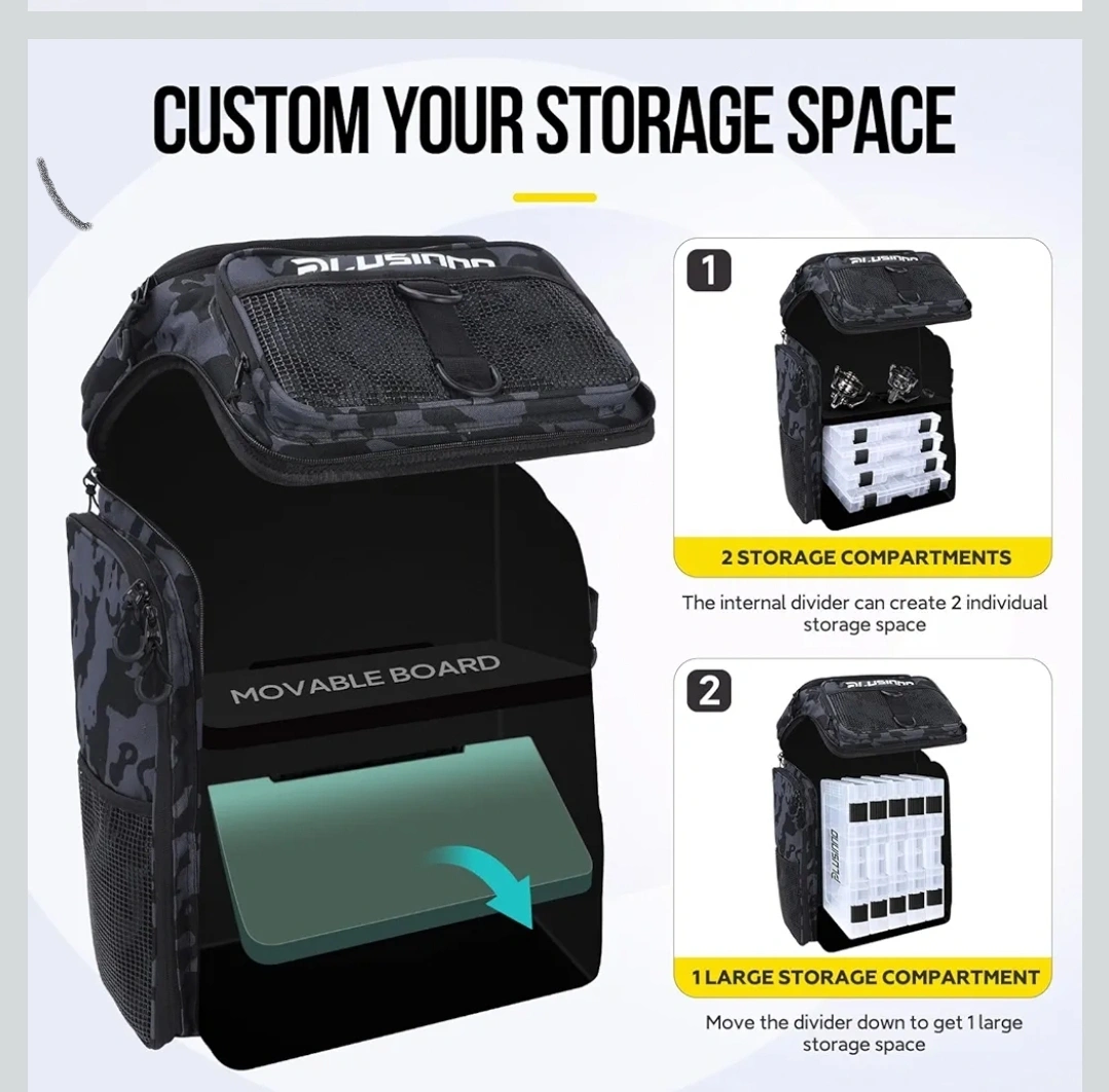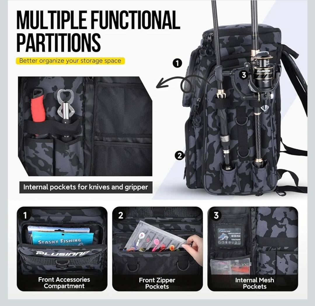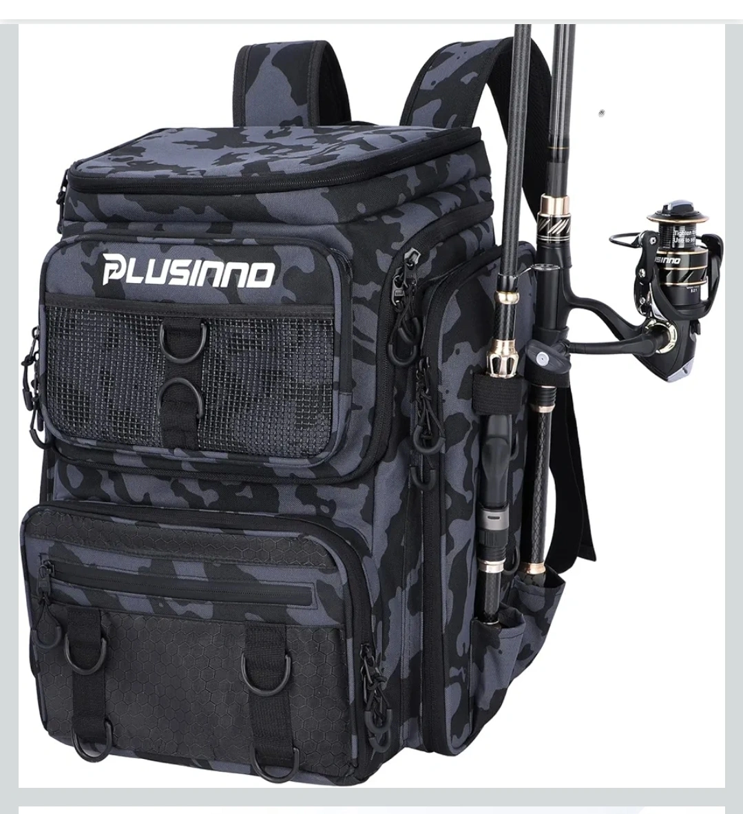 183I'm selling a PLUSINNO fishing tackle backpack. It features a movable board, allowing for 2 storage compartments or 1 large storage compartment. There are 16 pockets in total, including front zipper pockets, side zipper pockets, internal pockets, internal mesh pockets, rod pockets, and a main storage space that can store 4*3600 size tackle boxes. It's in new condition!