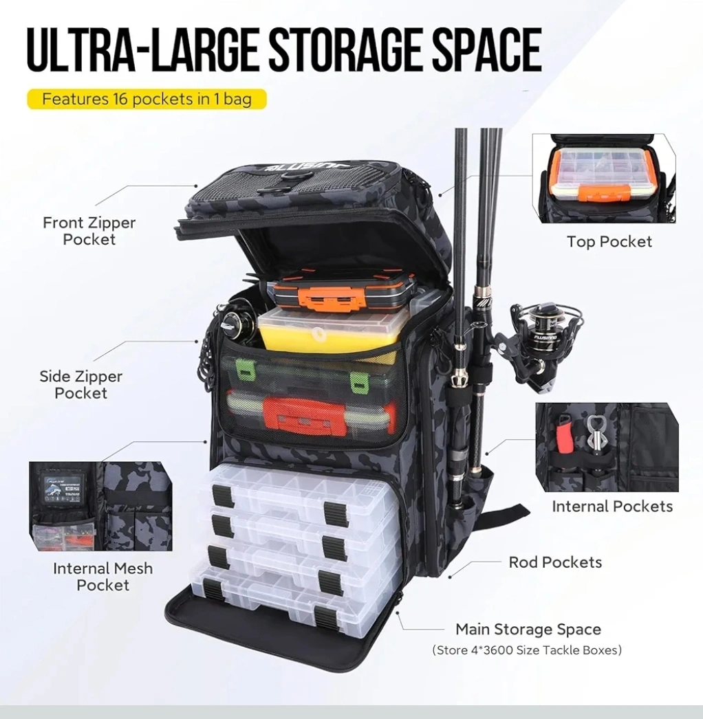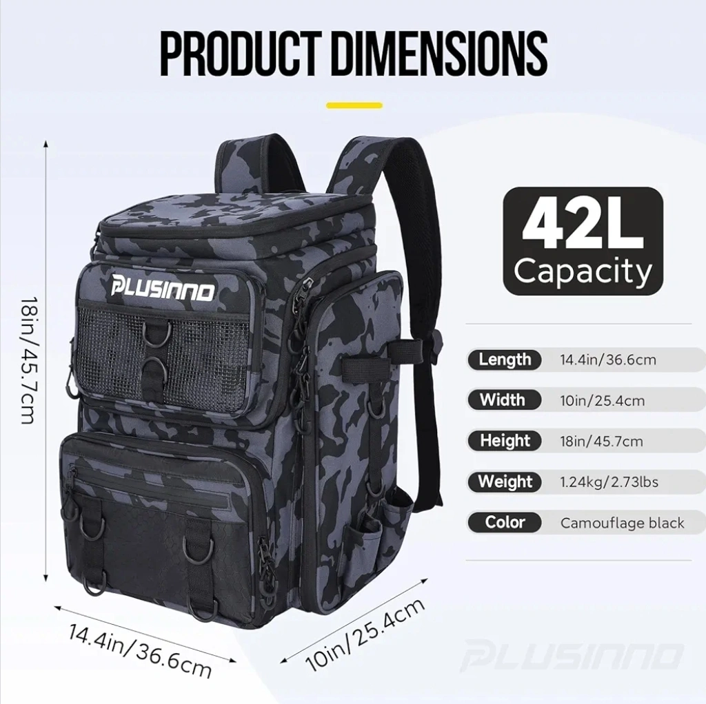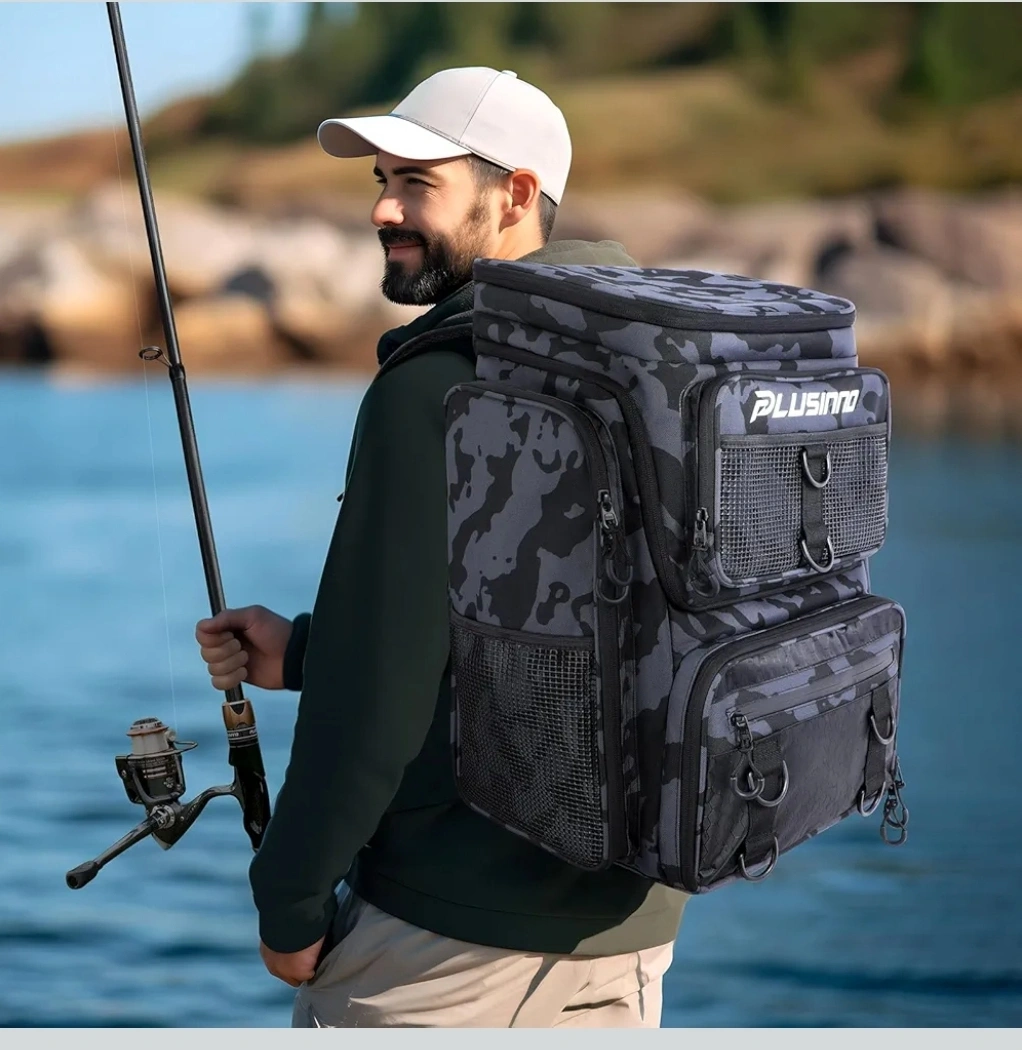183I'm selling a PLUSINNO fishing tackle backpack. It features a movable board, allowing for 2 storage compartments or 1 large storage compartment. There are 16 pockets in total, including front zipper pockets, side zipper pockets, internal pockets, internal mesh pockets, rod pockets, and a main storage space that can store 4*3600 size tackle boxes. It's in new condition!