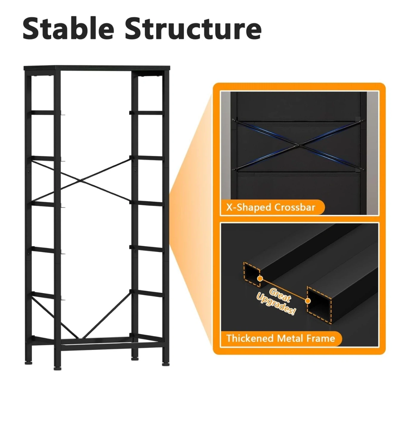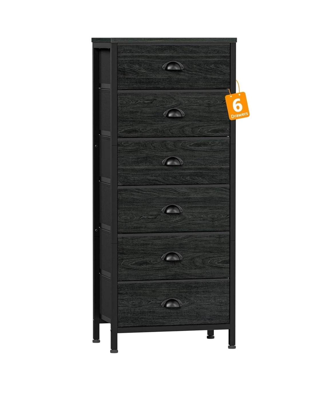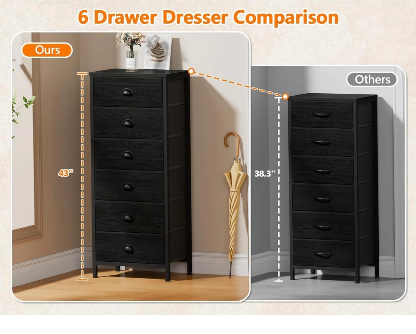 Selling a 6-drawer dresser that's 43 inches tall. It has a stable structure with an X-shaped crossbar and a thickened metal frame. Each drawer is about 6.3 inches tall and the overall dimensions are 43" x 16.3" x 11.4".