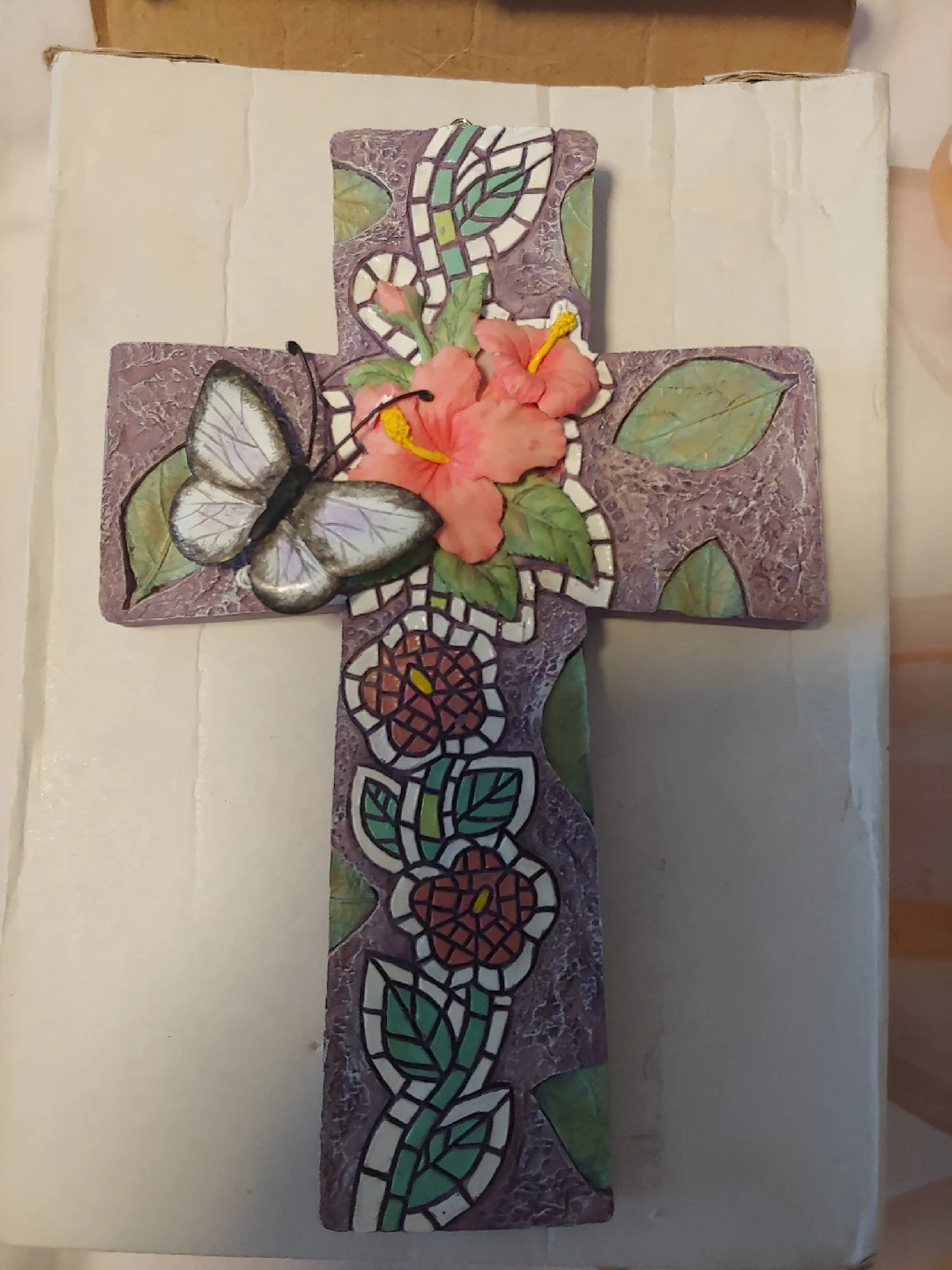 A lovely decorative cross featuring a butterfly and floral design. It measures approximately 9 inches by 6 inches. It is a bit heavy, so keep that in mind if planning to hang on wall. Comes in the box as shown. New