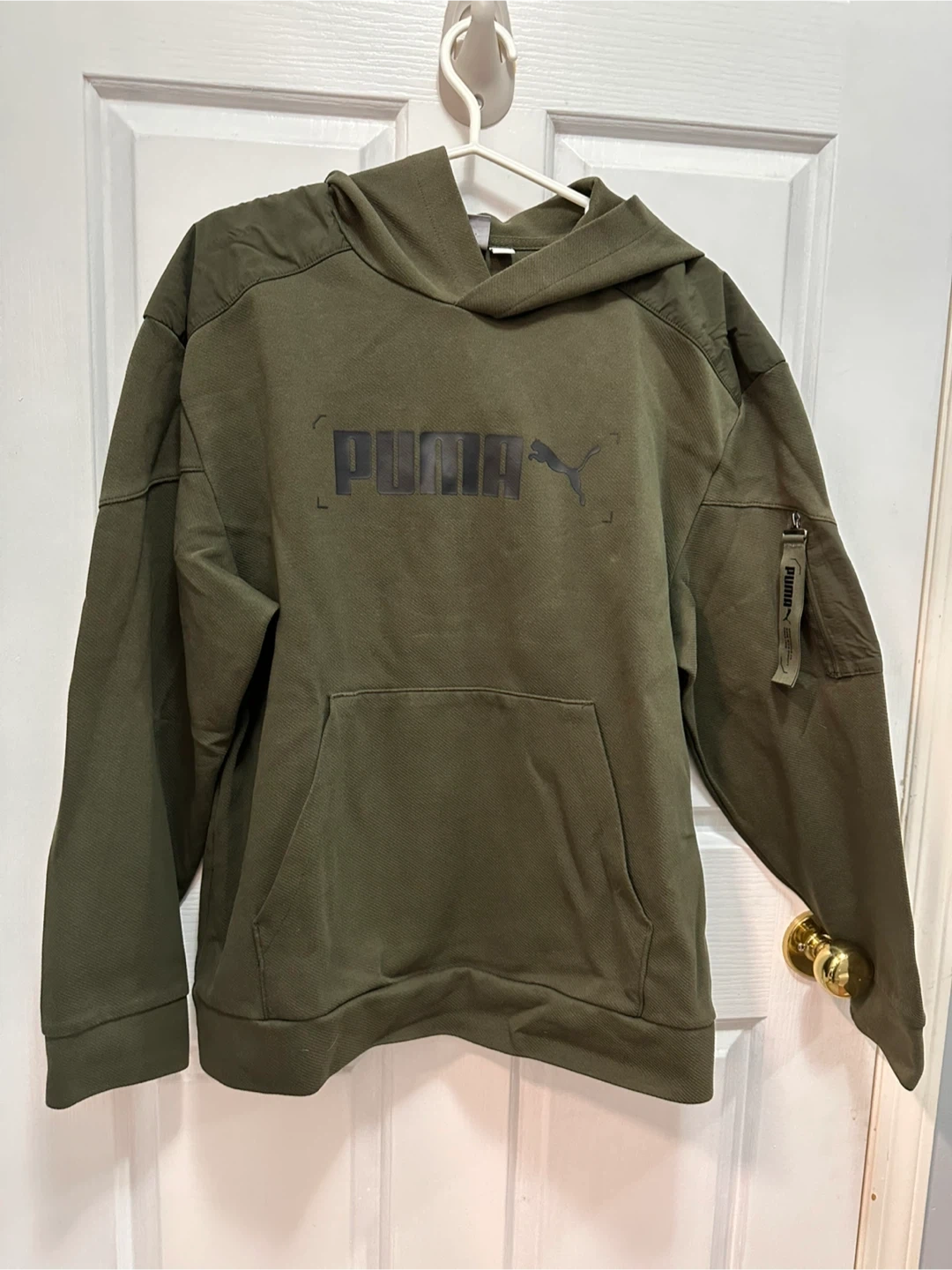 Selling a Puma hoodie in olive green, size medium. It's in great condition and features the Puma logo on the front. Perfect for staying cozy and stylish!