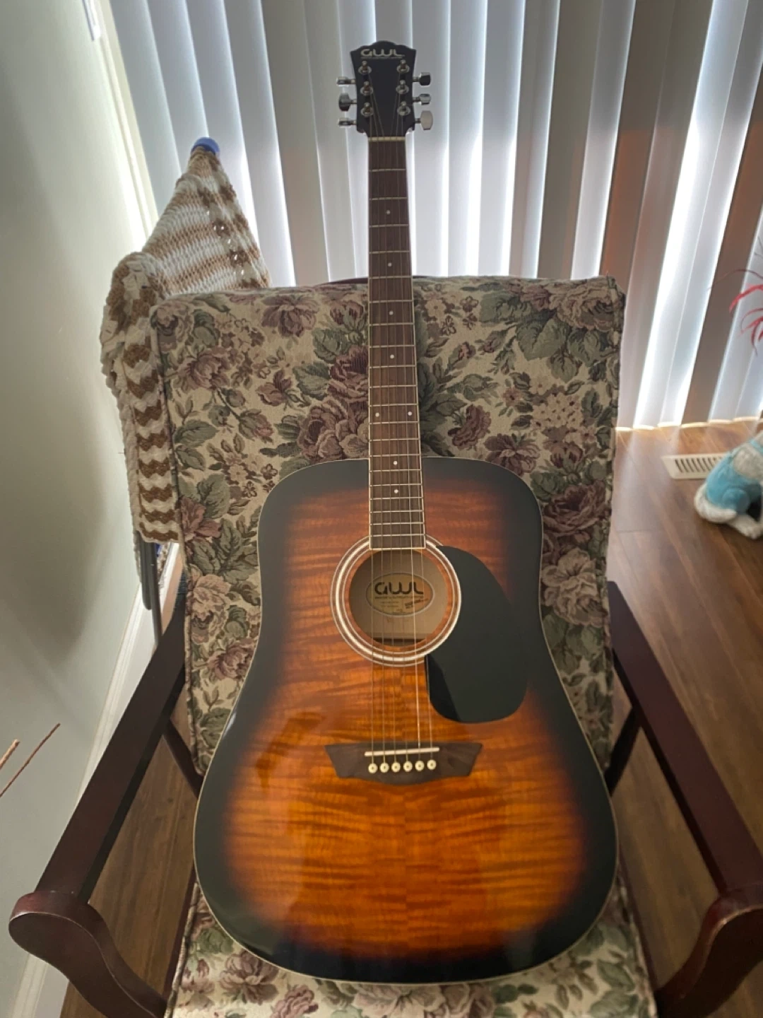 Selling a used GWL acoustic guitar! It's in good condition and has a beautiful tiger stripe finish. Perfect for beginners or experienced players looking for a reliable instrument