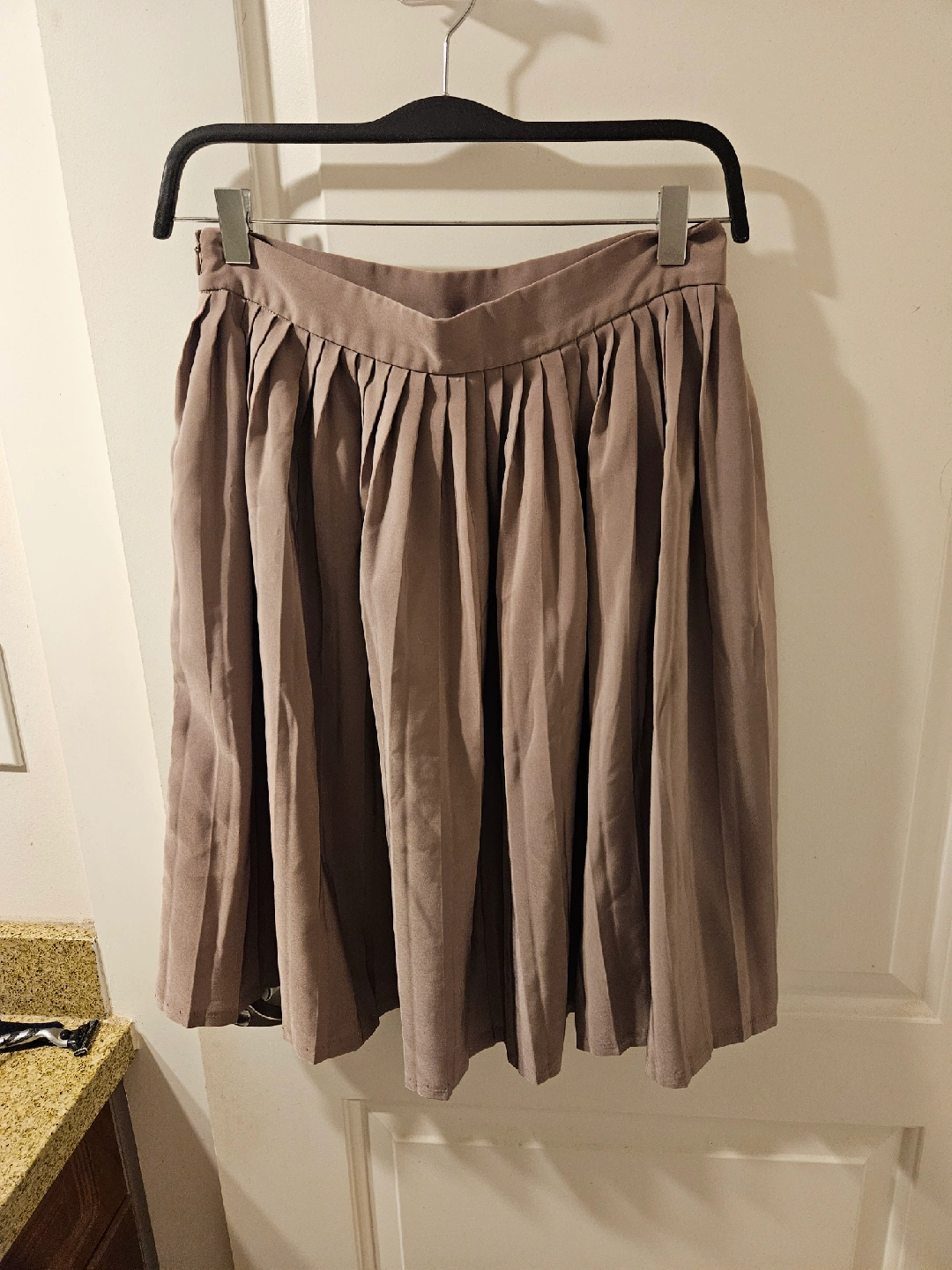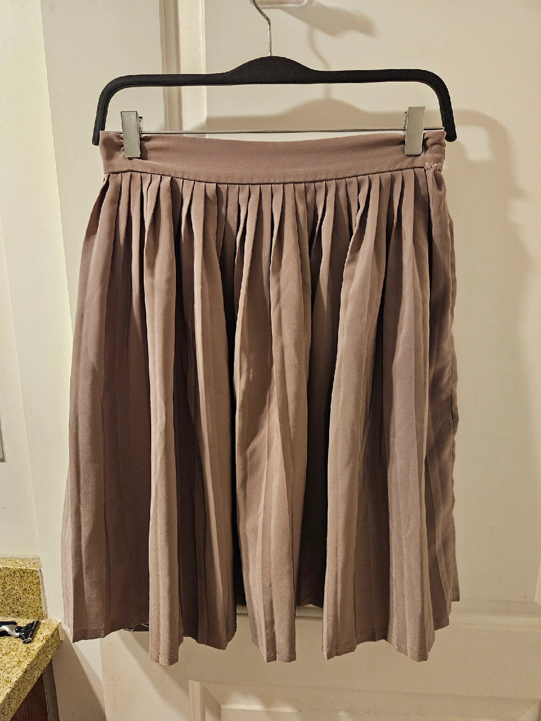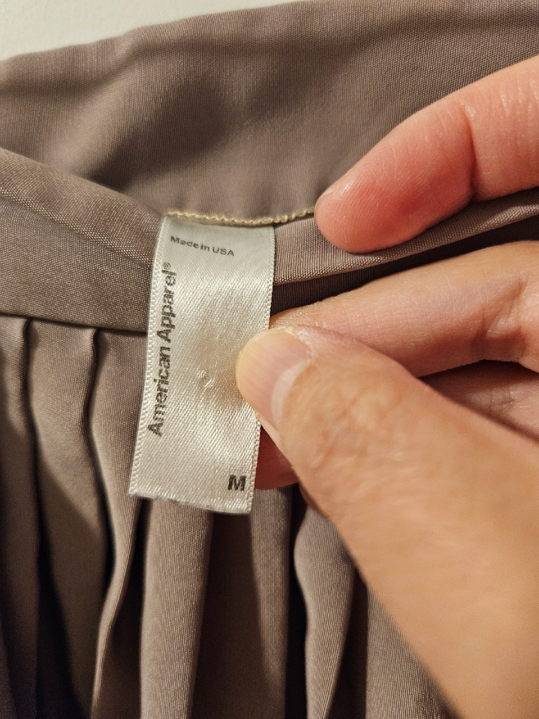 Selling an American Apparel pleated skirt in a neutral colour, size medium. It's a lovely piece, but there's a bit of wear and tear as shown in the picture hence the low price. This can easily be mended though!