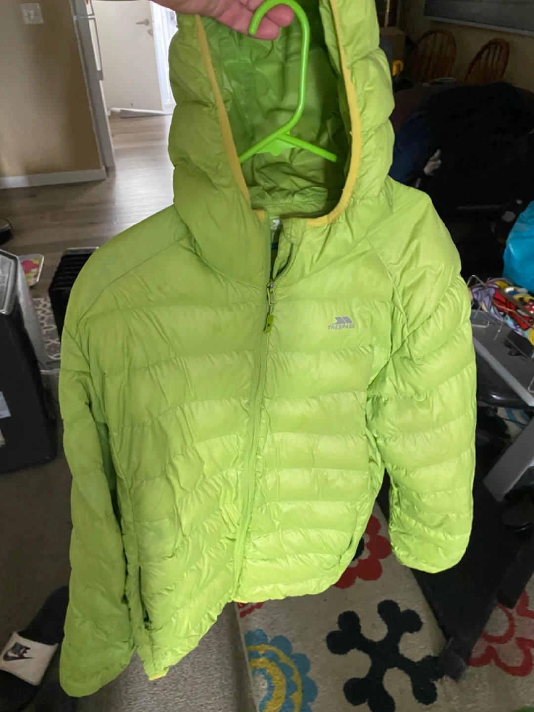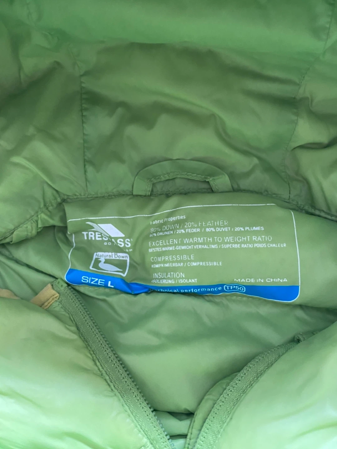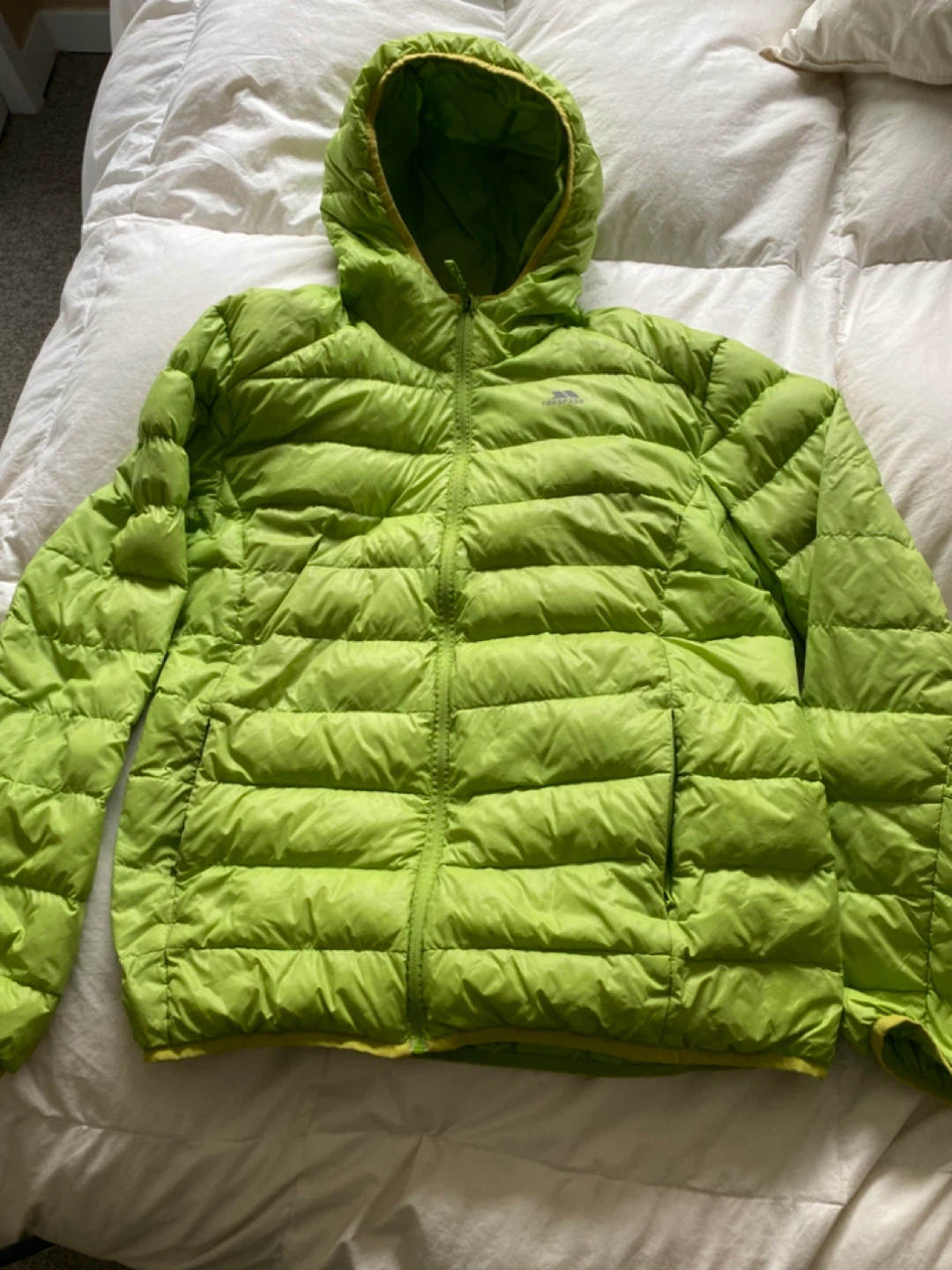 Selling a Trespass lightweight down puffer jacket in a vibrant green colour! It's a size L and made with 90% down and 10% feather for excellent warmth to weight ratio. This jacket is also compressible, making it easy to pack and carry around