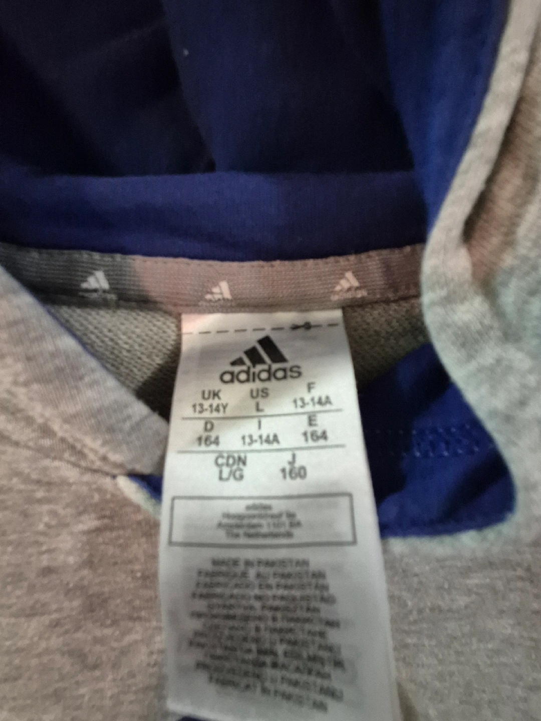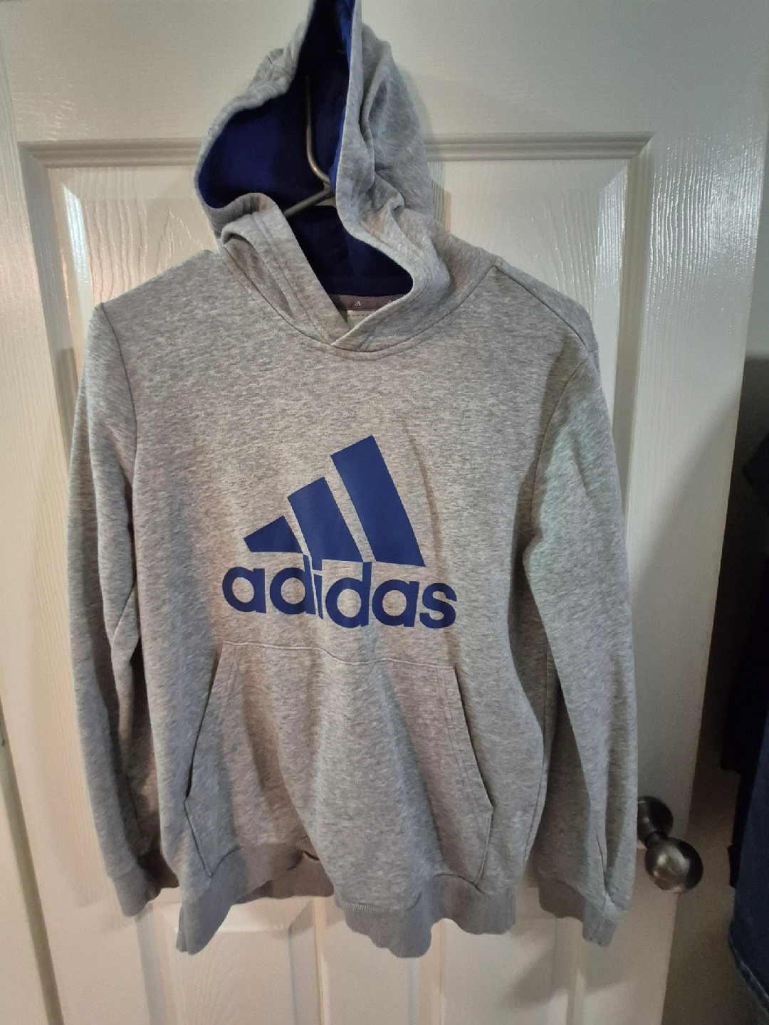 Selling an Adidas youth hoodie in size L/G (13-14Y). It's a comfy grey colour with the classic Adidas logo in blue. Perfect for staying warm and stylish!