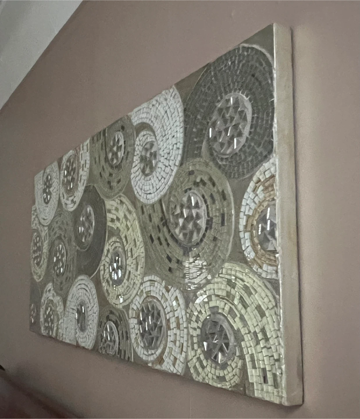 26Beautiful mosaic wall art with a unique round pattern design! It's in great condition and ready to add a touch of elegance to any room. The neutral colors make it versatile for various decor styles