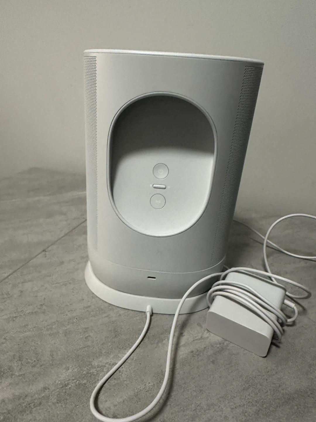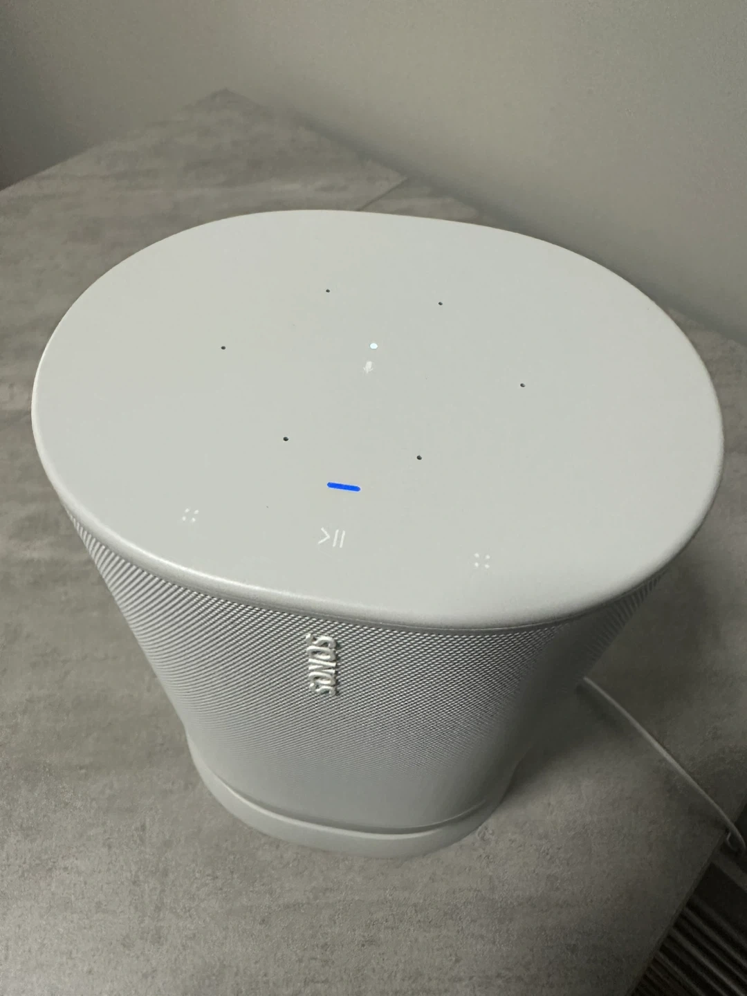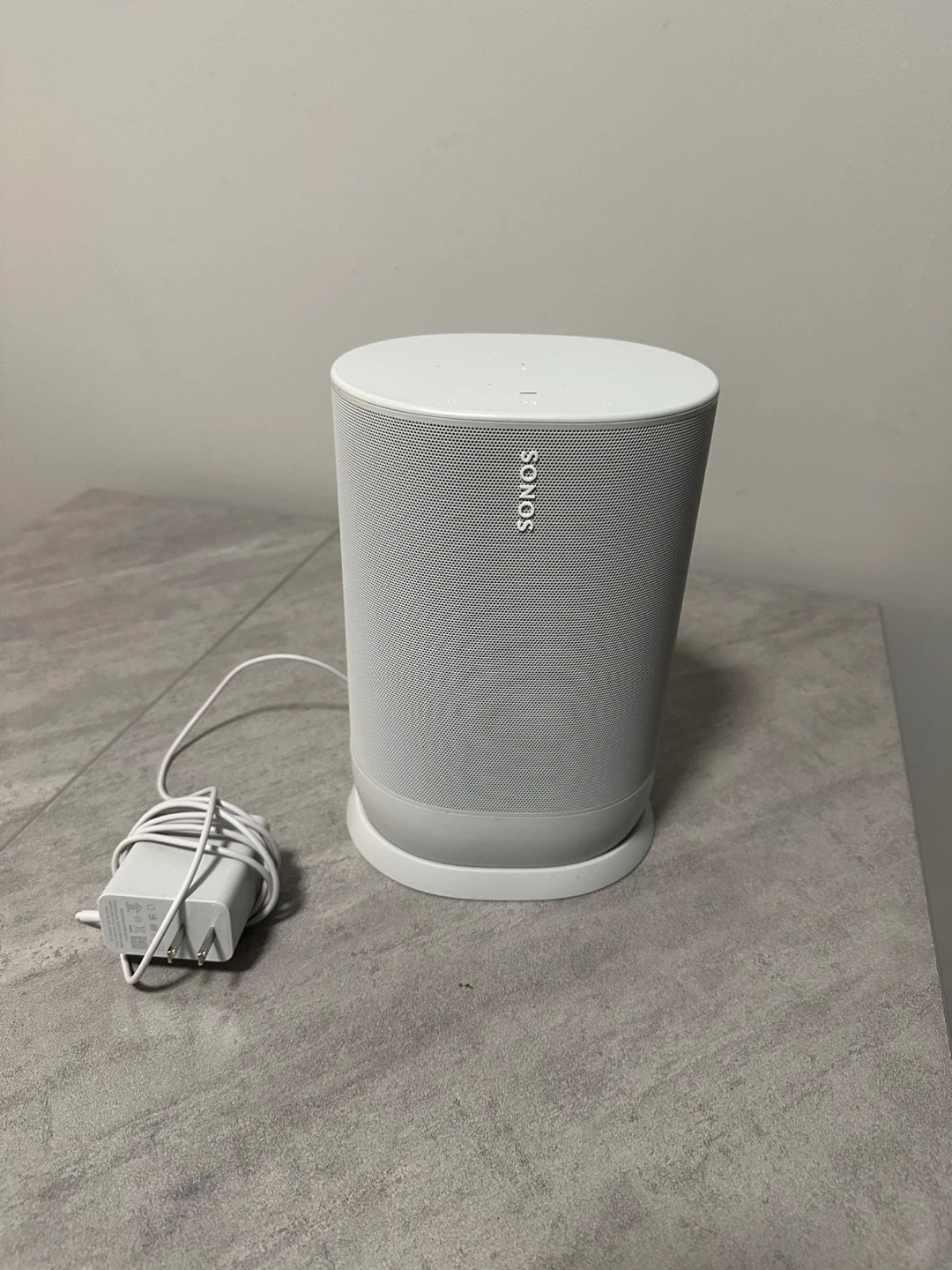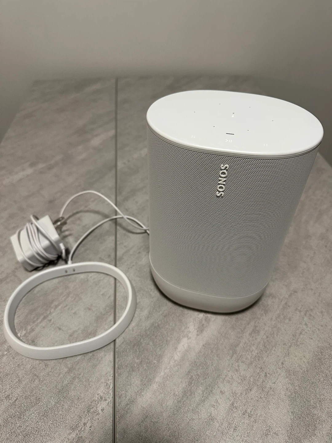 Selling a Sonos Move portable speaker in white. It's in great condition and comes with the charging base and power adapter. Perfect for taking your music on the go, whether you're indoors or outdoors
