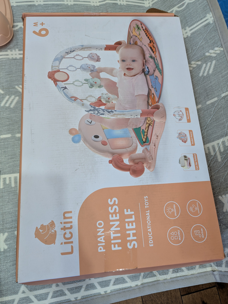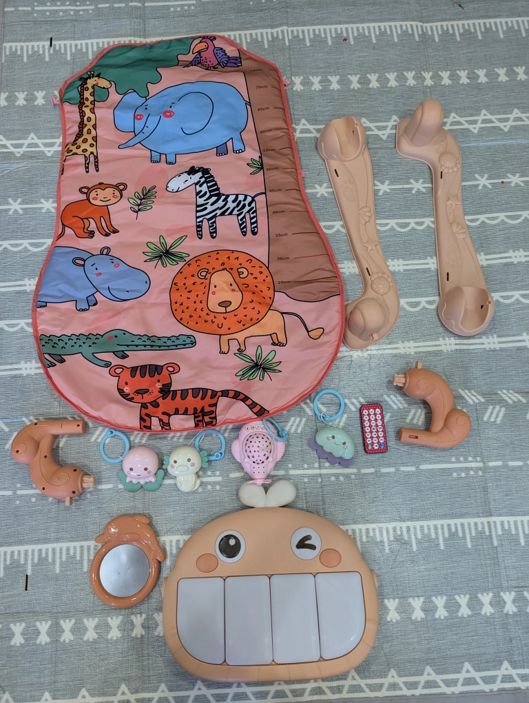 Selling a Lictin Piano Fitness Shelf educational toy for babies 6+ months (Baby Gym). It's in great condition and comes with all the pieces shown in the photos! This toy is perfect for developing your little one's motor skills and coordination. It features a piano keyboard, hanging toys, and a soft play mat with cute animal designs. Your baby will love exploring all the different textures, sounds, and colours!