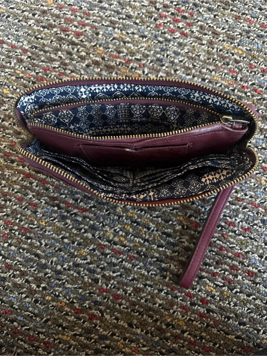 63Women’s burgundy wristlet with unique snowflake design featuring multiple pockets and metal zipper closure with included wrist strap. The interior has multiple compartments for cards and cash great for the on the go lady who wants to travel light but take Everything. Local pick up Only !!!