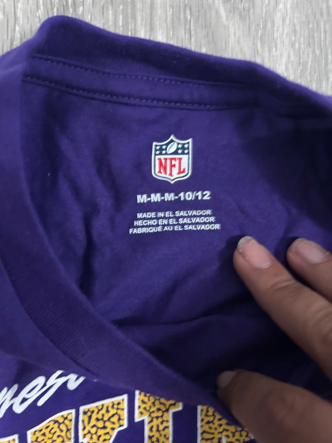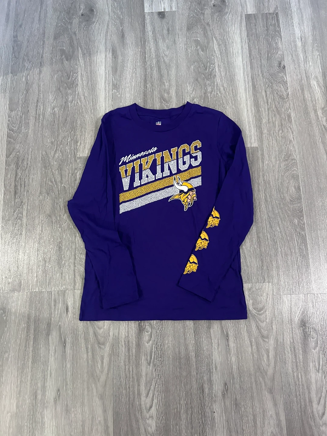 Here's a Minnesota Vikings long sleeve shirt, perfect for a young fan! It's an NFL licensed product and is sized M (10/12). It's purple with the Vikings logo and design. Great for showing team spirit!