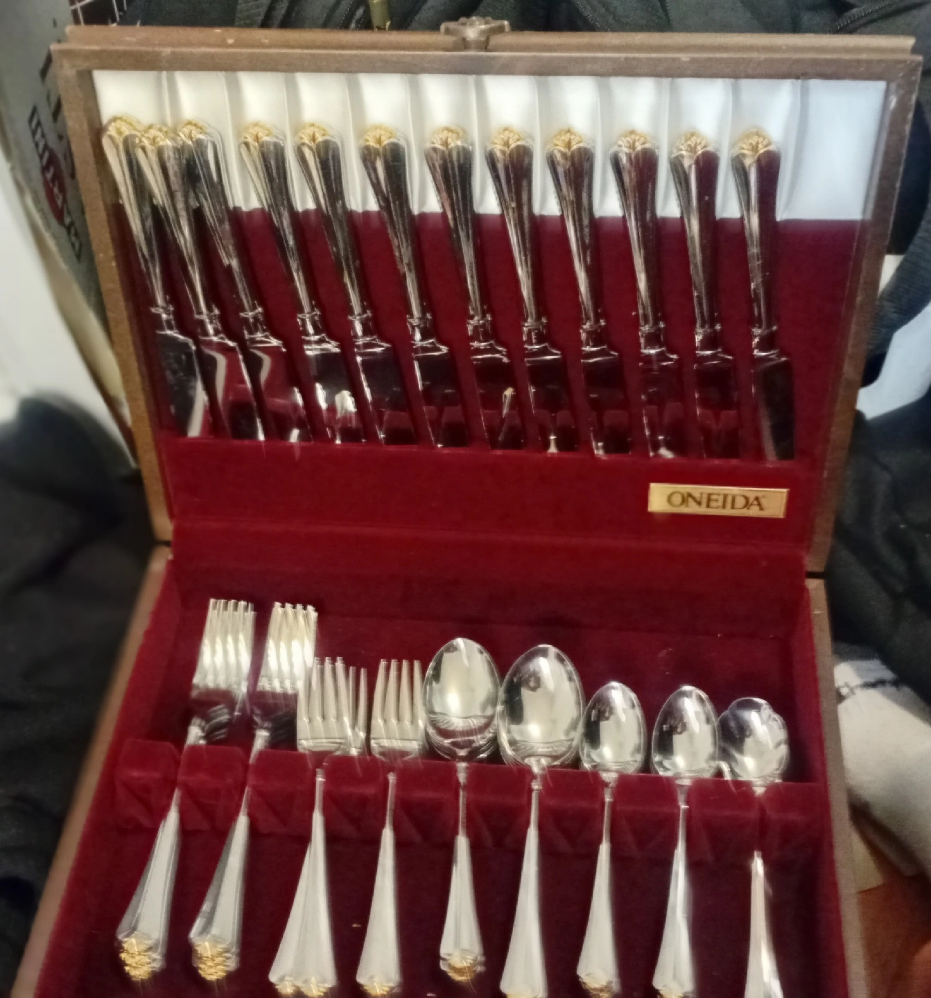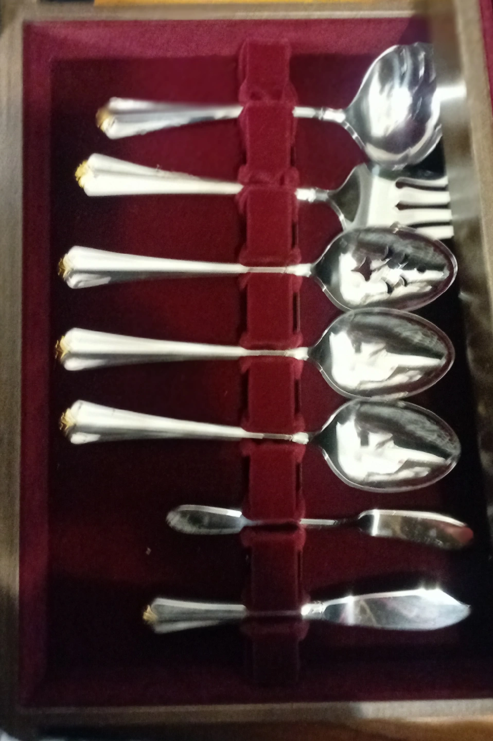 Selling a Oneida silverware set complete with its original wooden case. The set includes knives, forks, and spoons, all neatly arranged in a red velvet-lined box. Perfect for adding a touch of elegance to your dining experience!