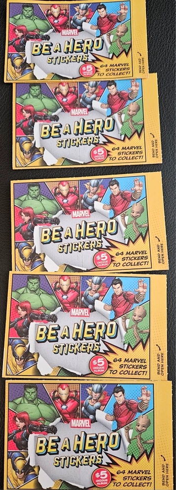 5 packs of Marvel 'Be A Hero' stickers! Each pack contains 64 stickers to collect. Perfect for any Marvel fan!