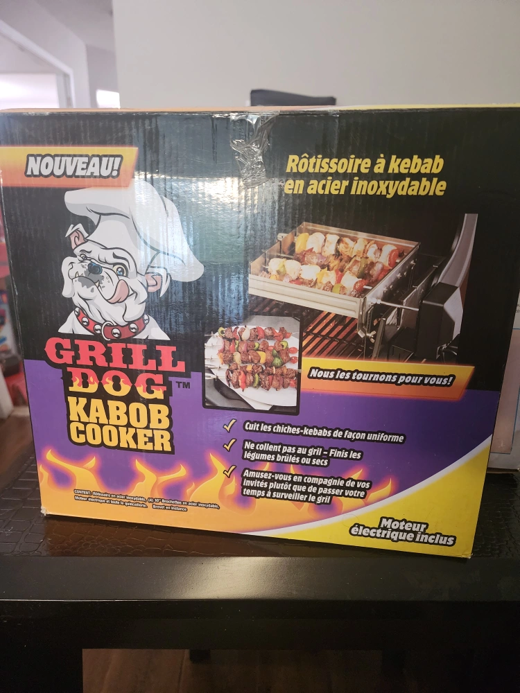 Selling a brand new Grill Dog Kabob Cooker! It's a rotisserie-style kebab maker made of stainless steel. The box says it cooks kebabs evenly and prevents sticking, so no more burnt veggies! It also includes an electric motor so you can spend less time watching the grill and more time with your guests