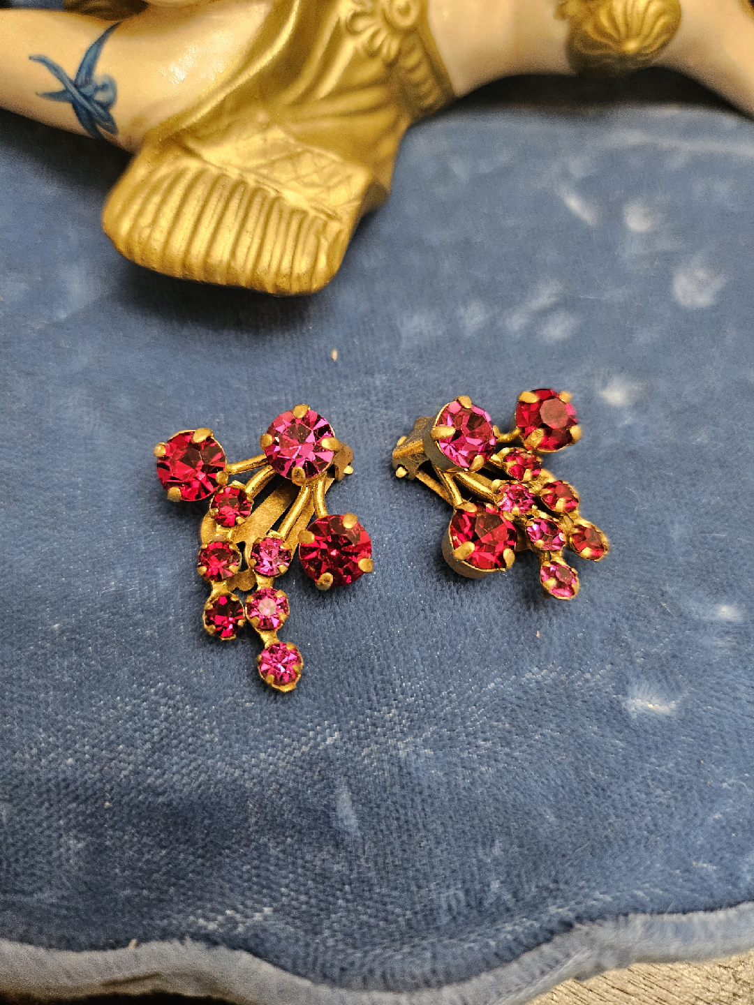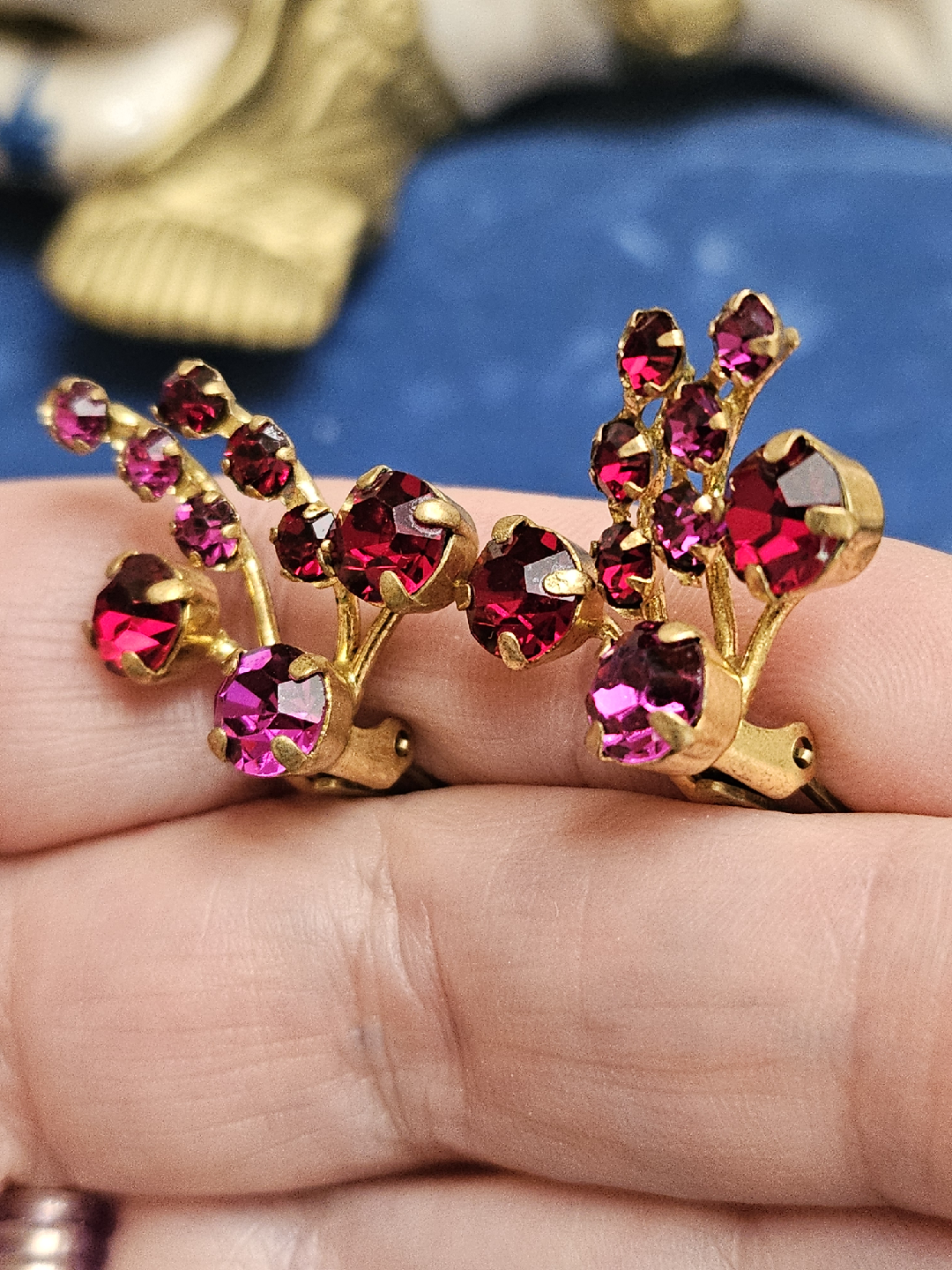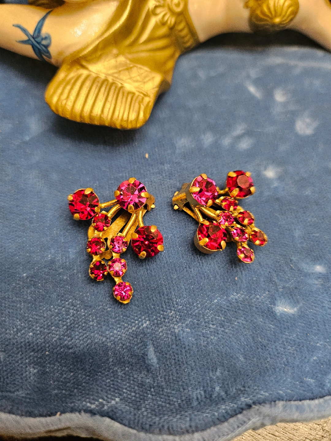These vintage earrings are marked "Made Austria". They feature a gold tone metal and clusters of red rhinestones. They are clip-on style earrings.