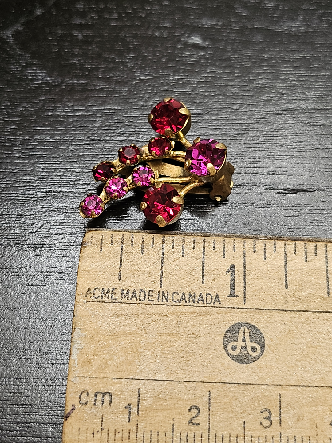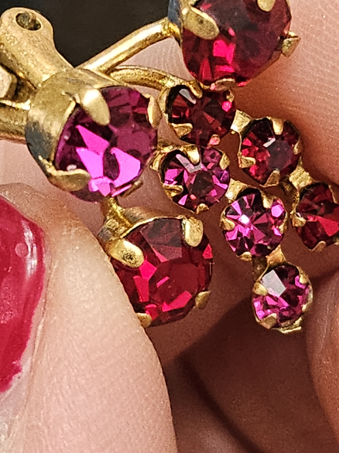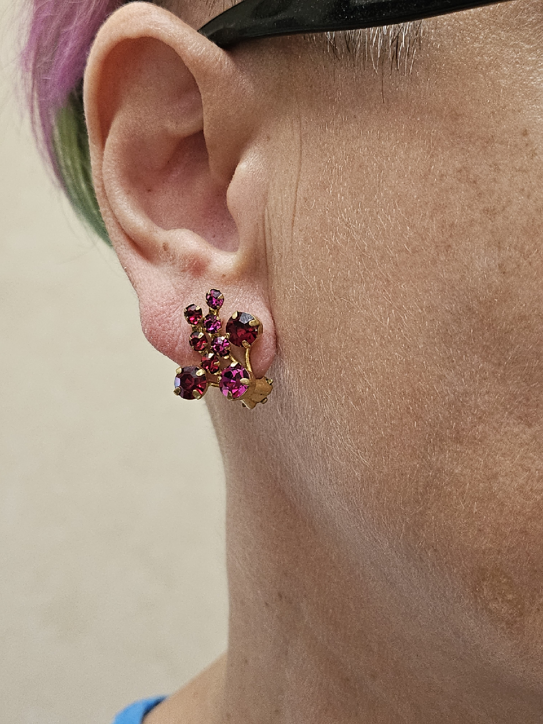 These vintage earrings are marked "Made Austria". They feature a gold tone metal and clusters of red rhinestones. They are clip-on style earrings.