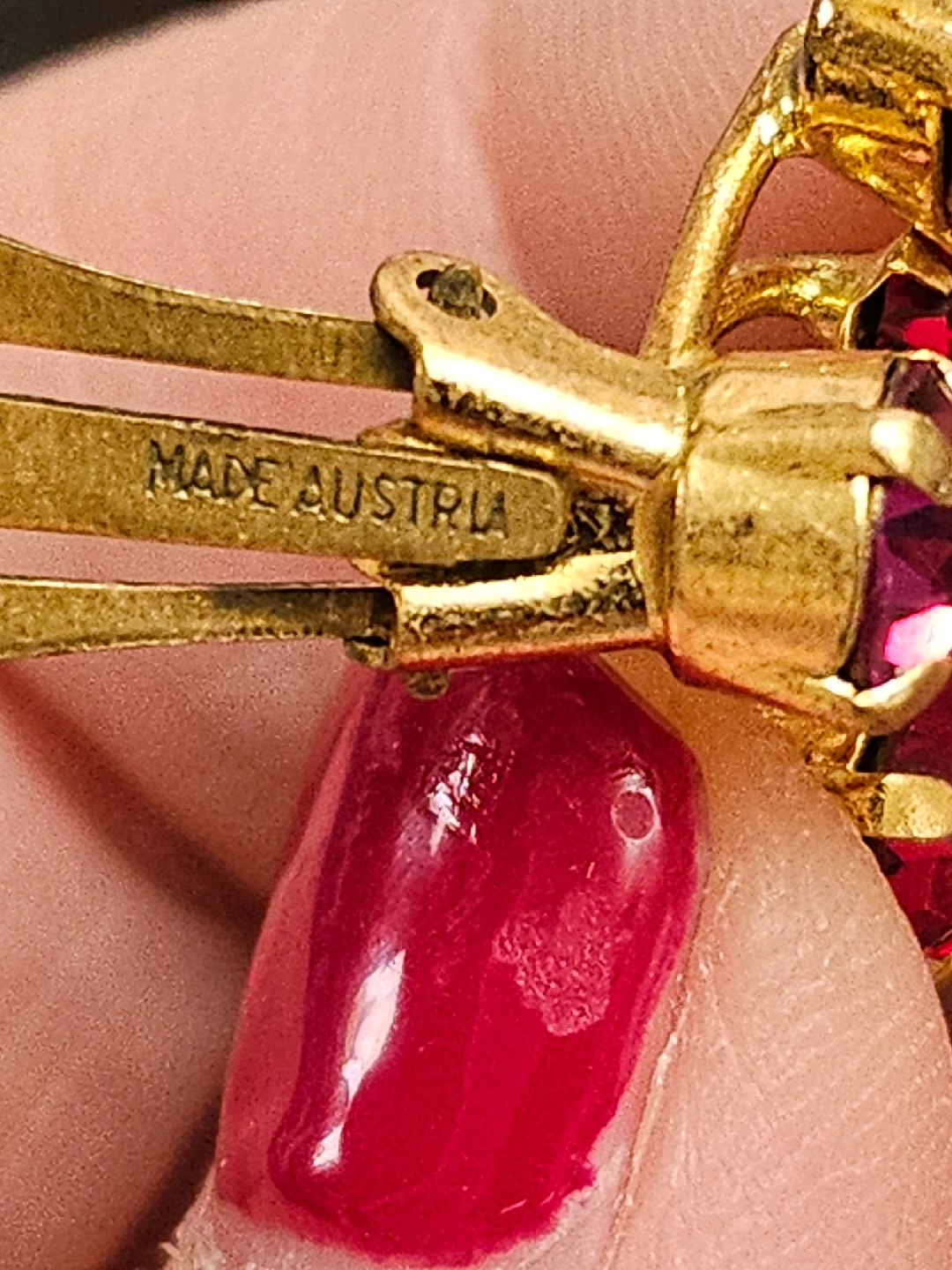 Vintage Made Austria Gold Tone & Red Rhinestone Earrings