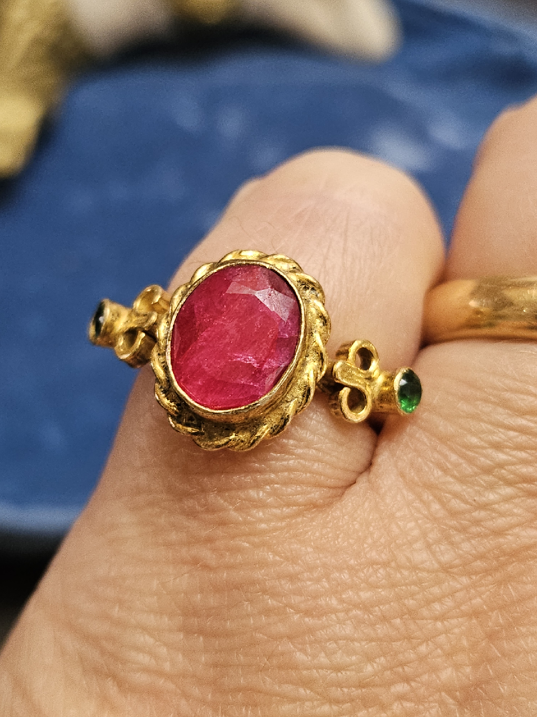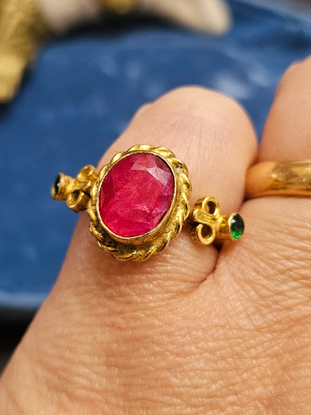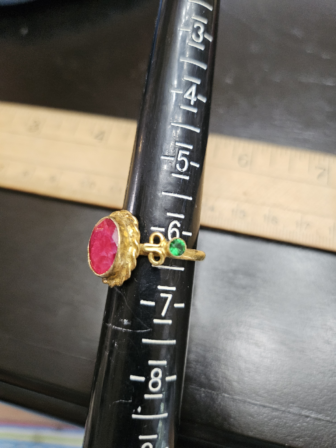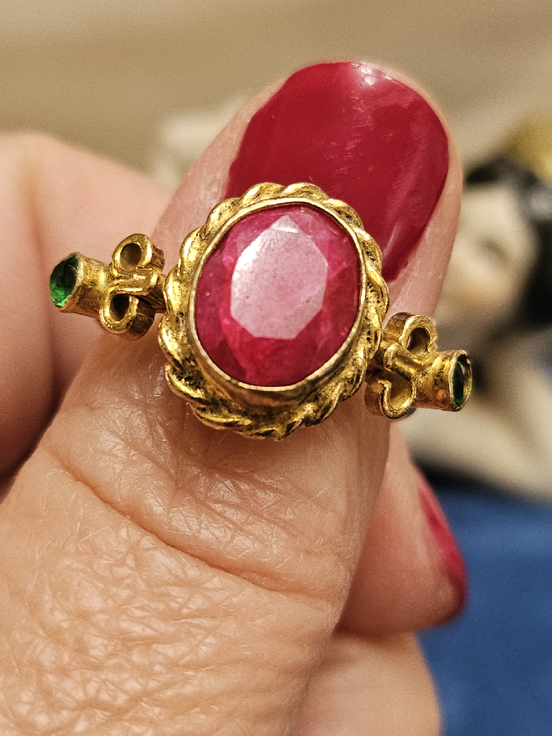 Selling a vintage ring, crafted in gold tone and featuring a beautiful ruby.I think that the ruby is a natural ruby but I am not sure.The ring also has small green stones accenting the design. It's marked 925.. size 6.25