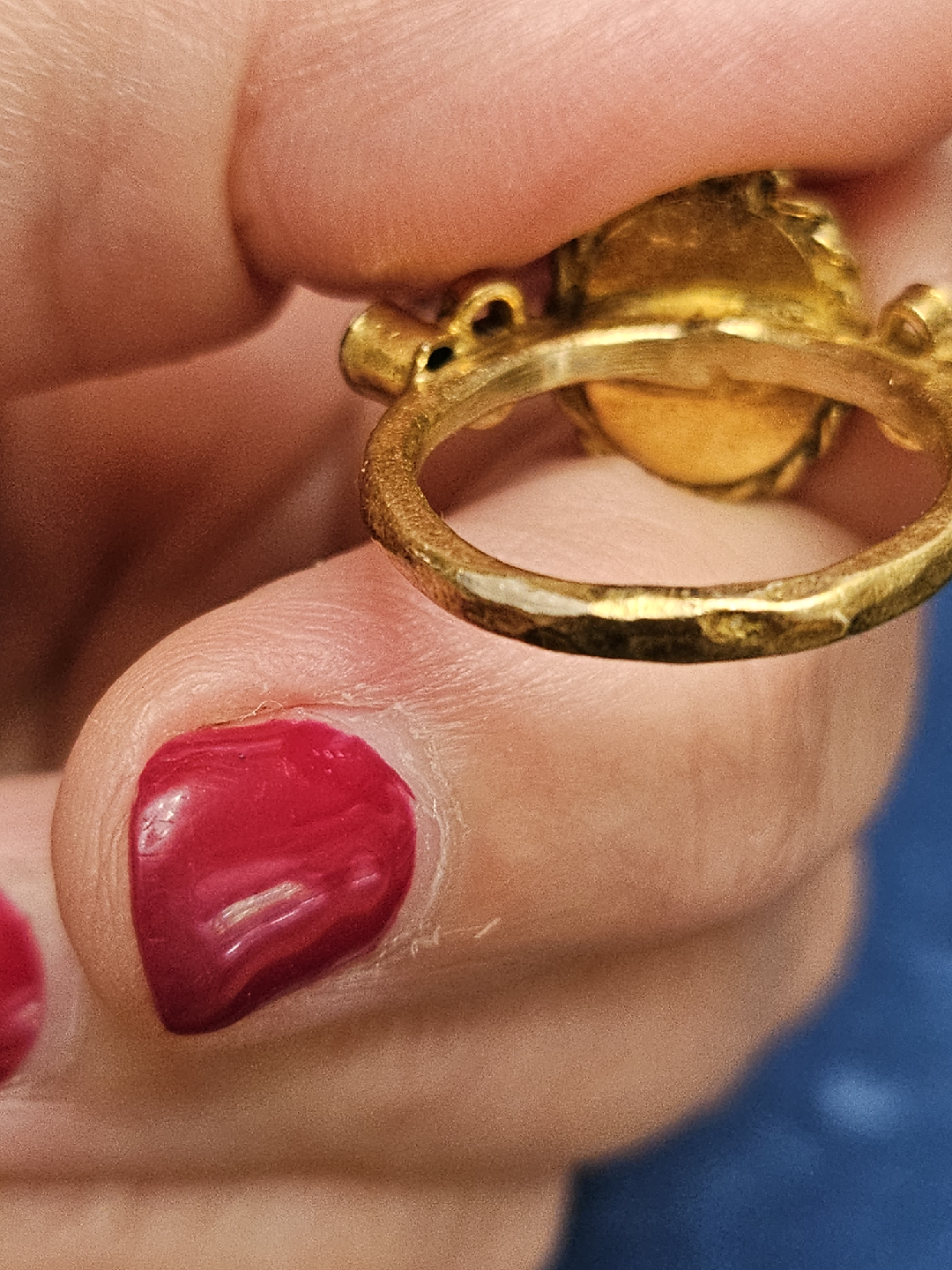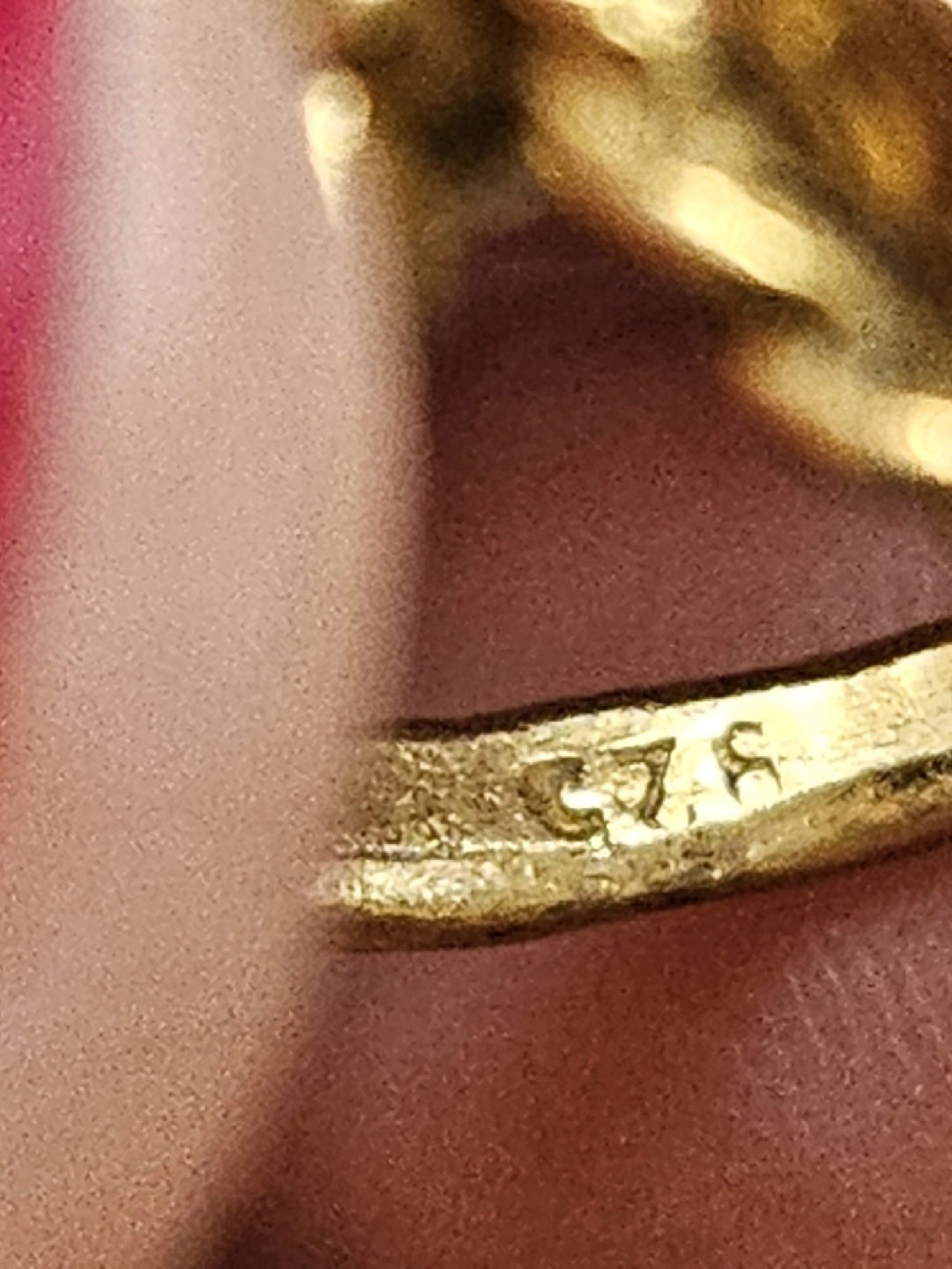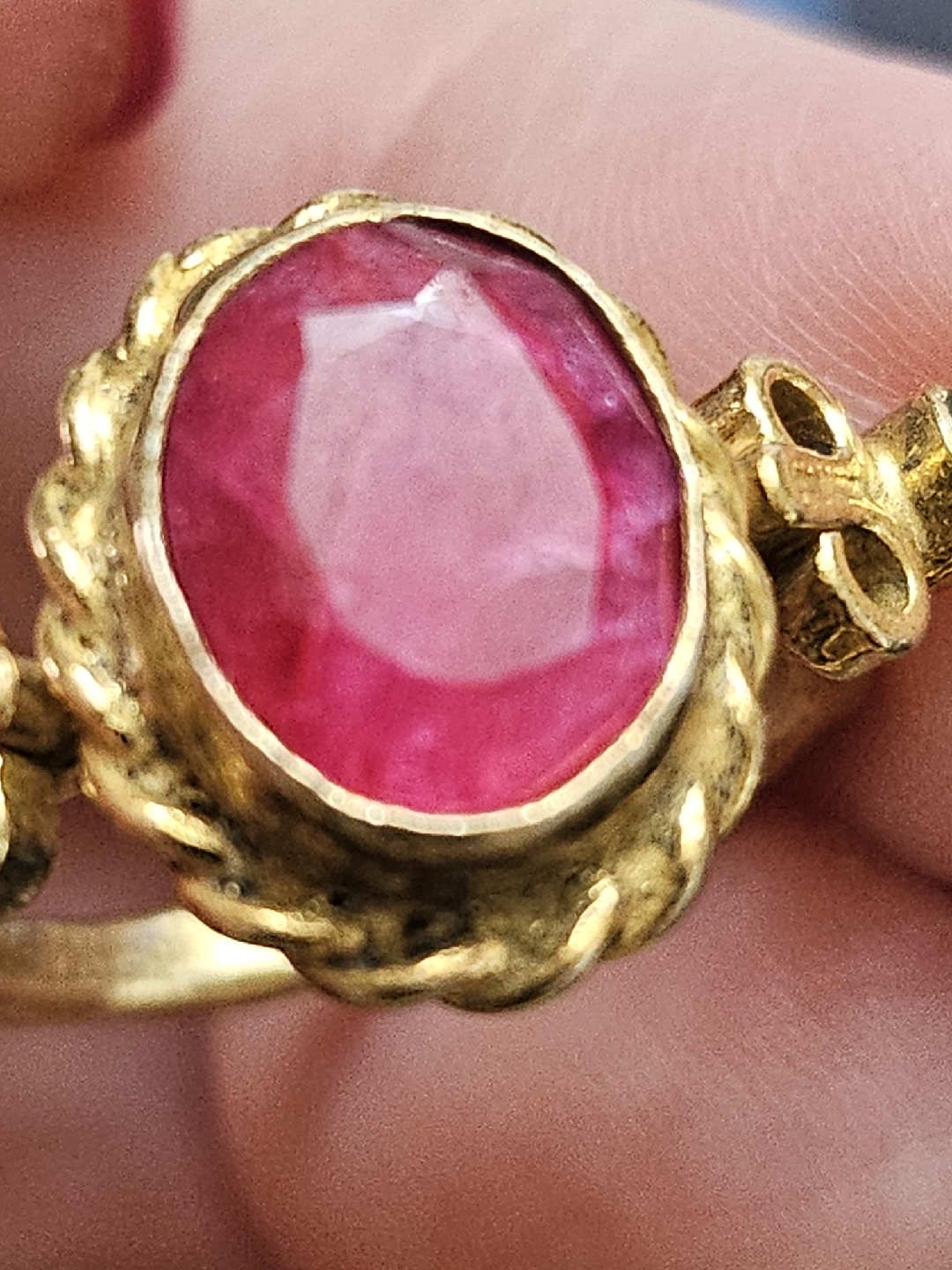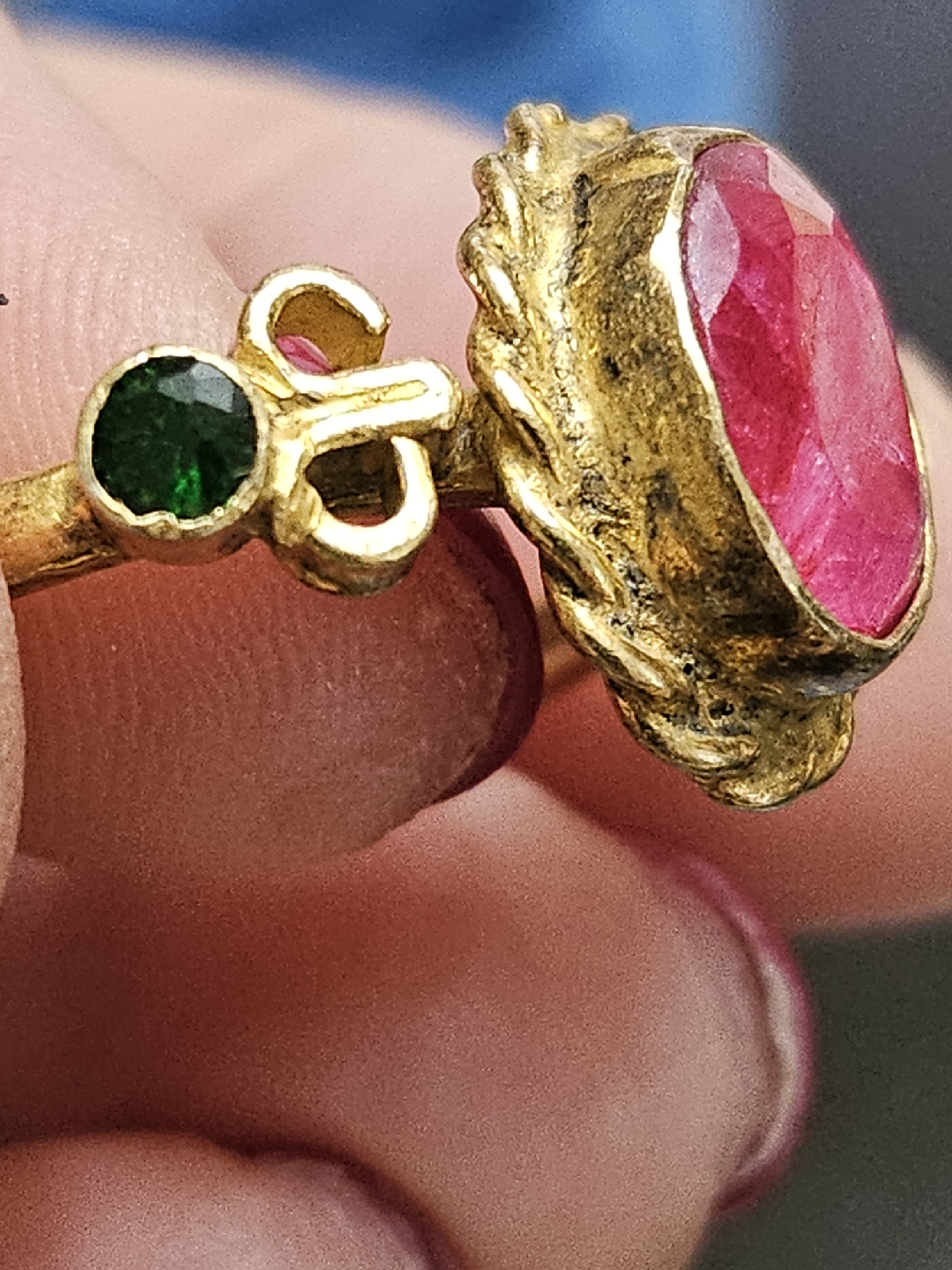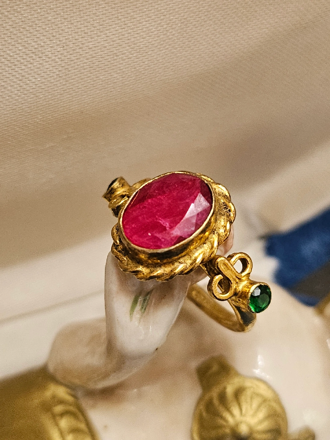 Selling a vintage ring, crafted in gold tone and featuring a beautiful ruby.I think that the ruby is a natural ruby but I am not sure.The ring also has small green stones accenting the design. It's marked 925.. size 6.25