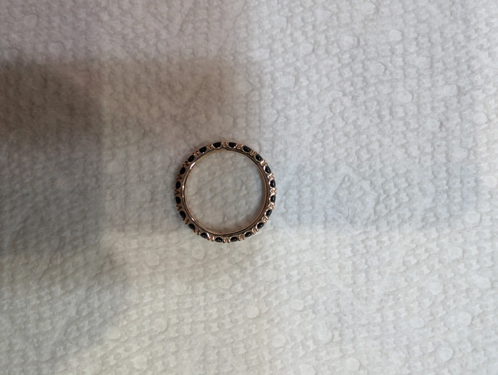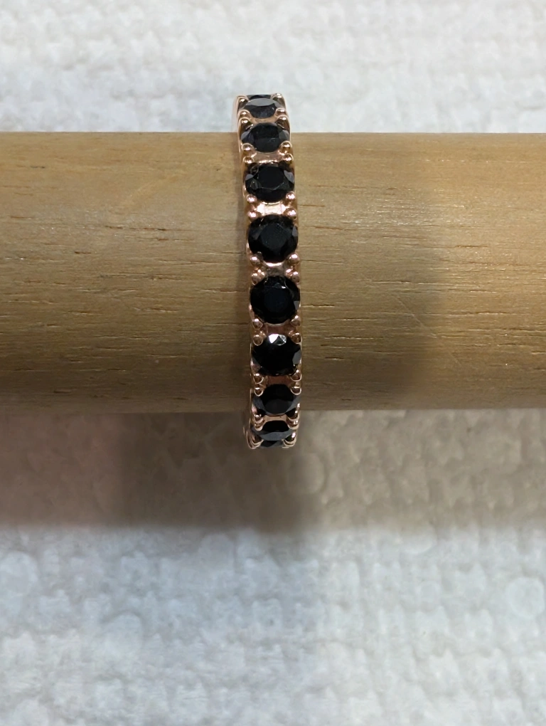 Selling a lovelyPp Pandora rose gold 15 KT Plated eternity ring featuring black stones. The Pandora black Eternity is a stylish and elegant piece of jewelry, marked Ale Met 60 - Size # 8