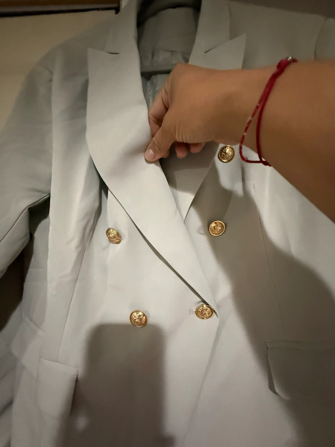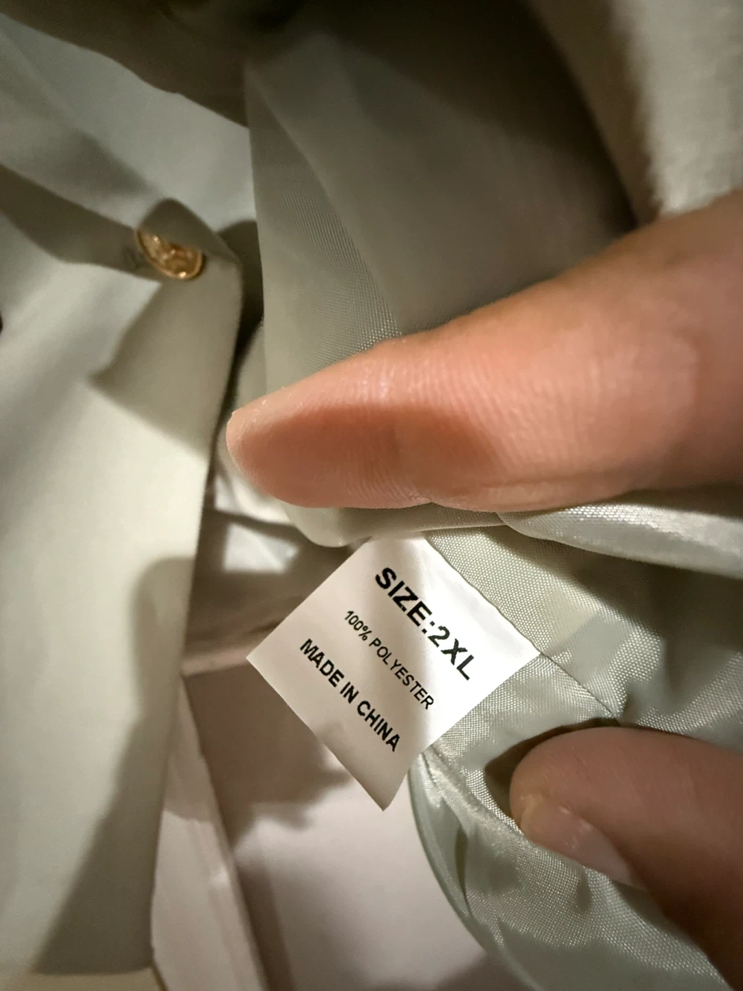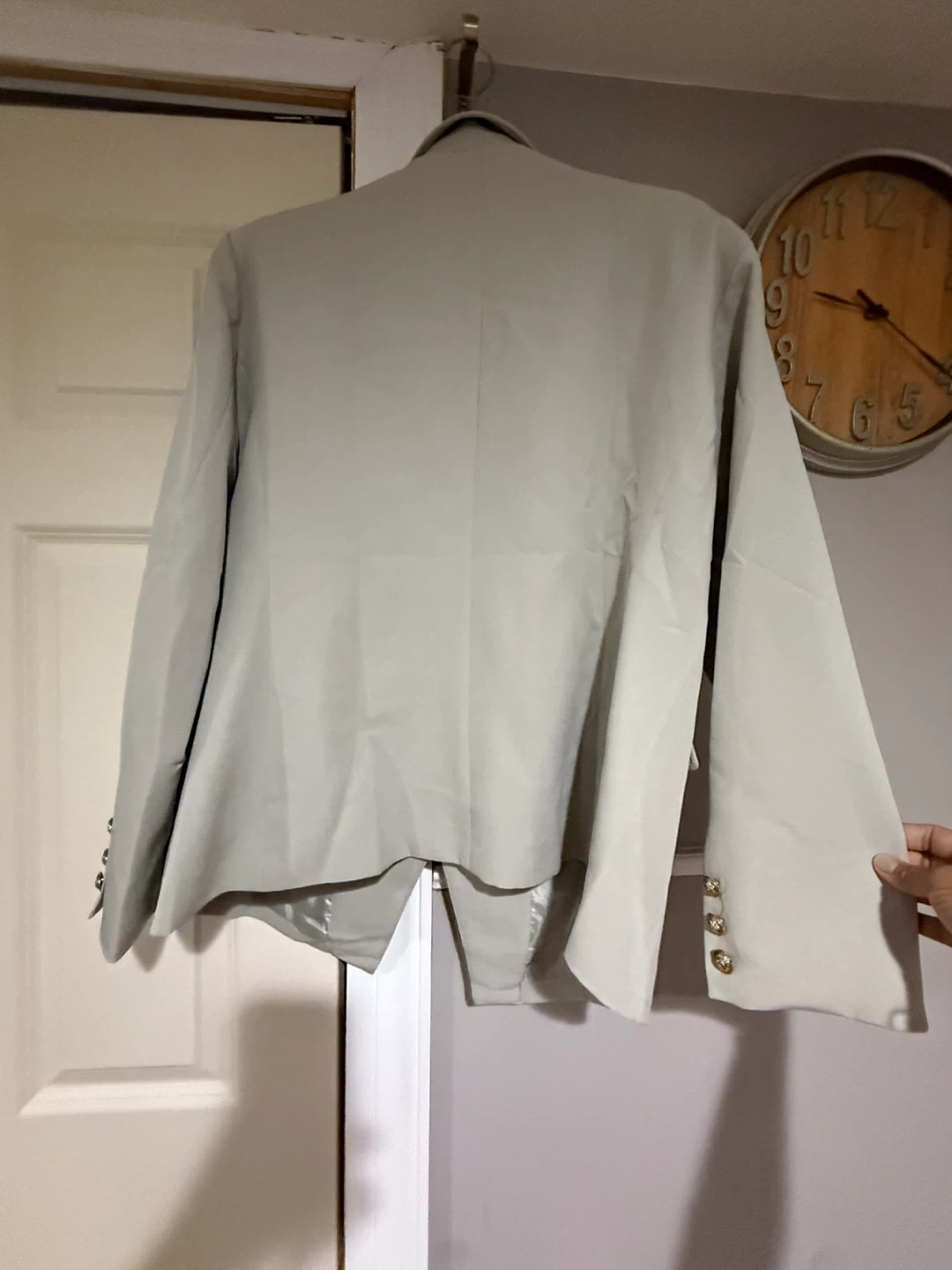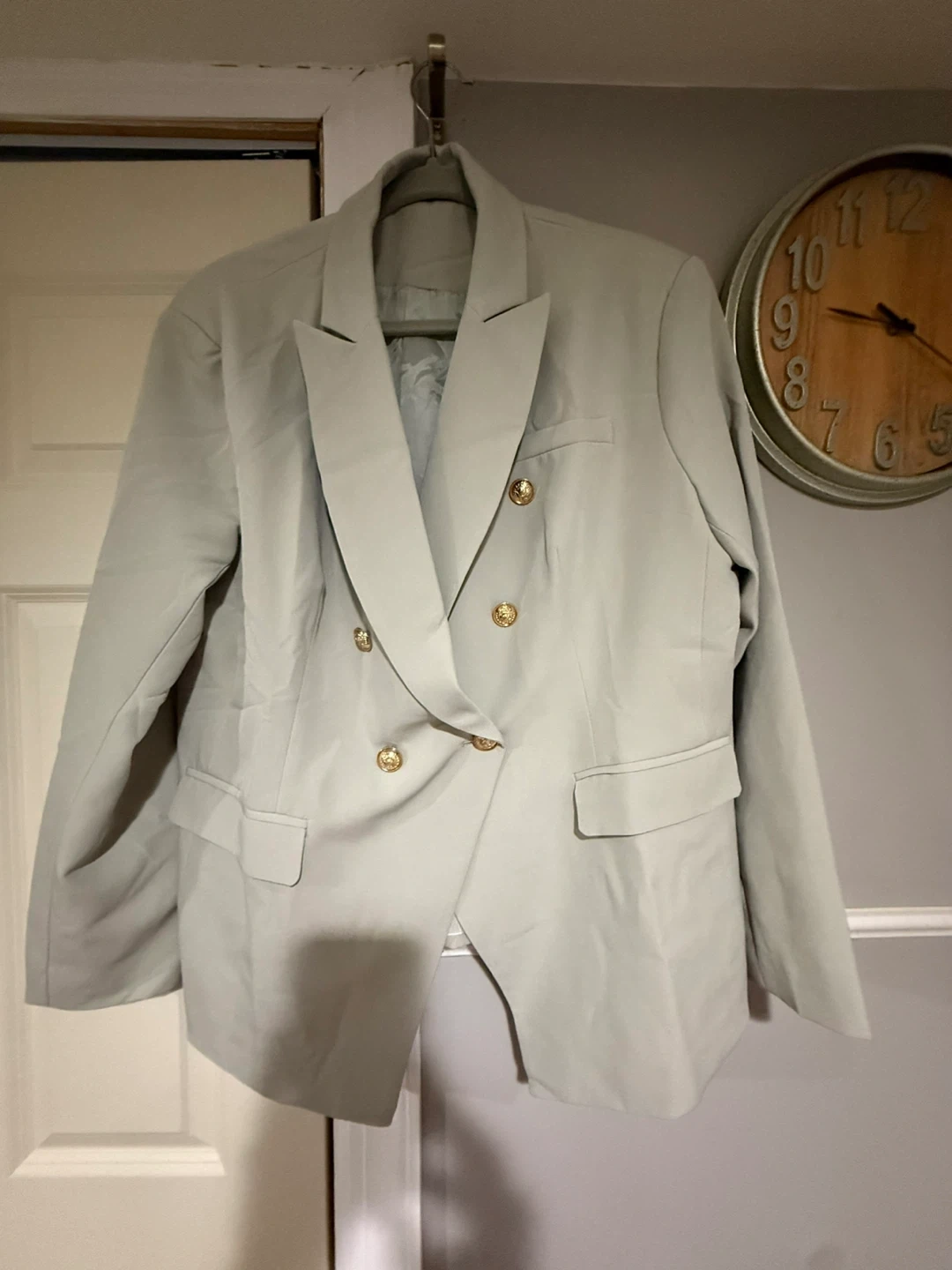 Selling a Misslook double-breasted blazer in size 2XL. The blazer is a light green color and made of 100% polyester. It features gold-colored buttons and a stylish design