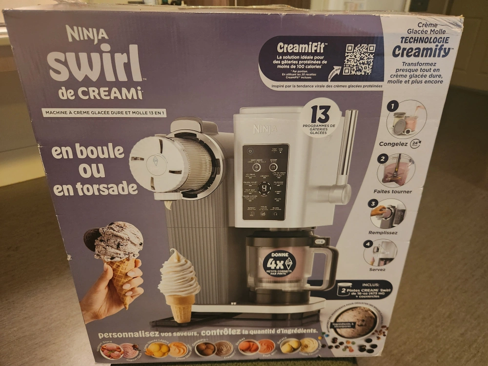 Get ready to make delicious ice cream at home with the Ninja Swirl de Creami! This machine can make both hard and soft ice cream, with 13 different programs to choose from. It's designed to help you personalize your flavours and control the ingredients you use. Enjoy creating your own frozen treats!