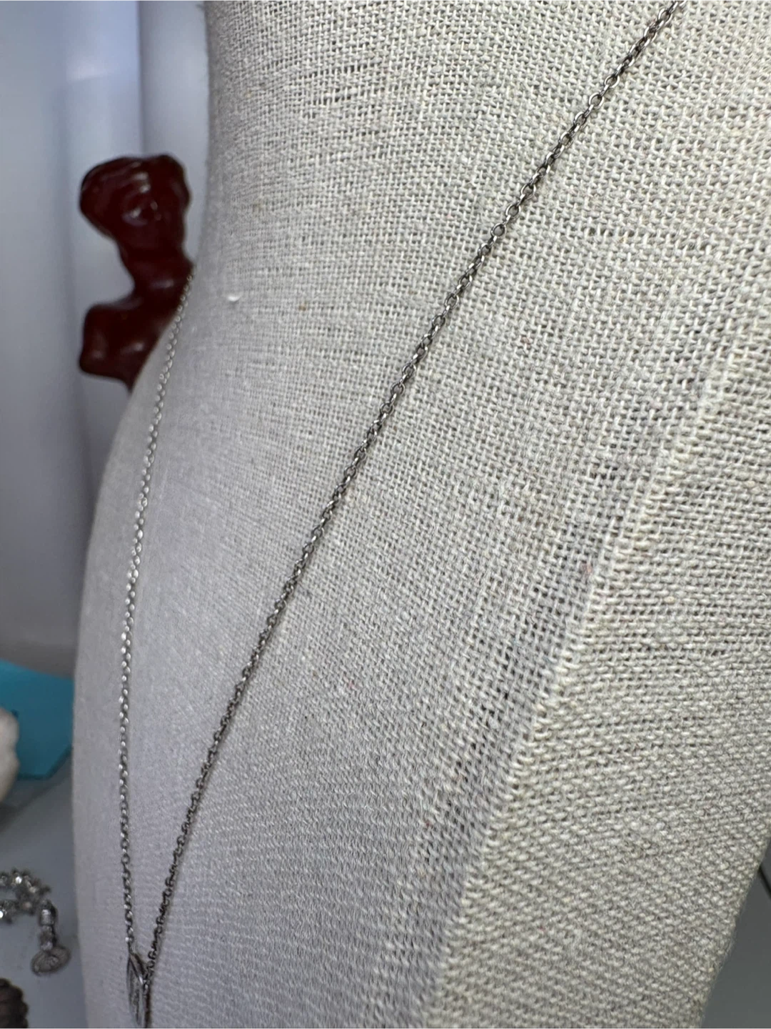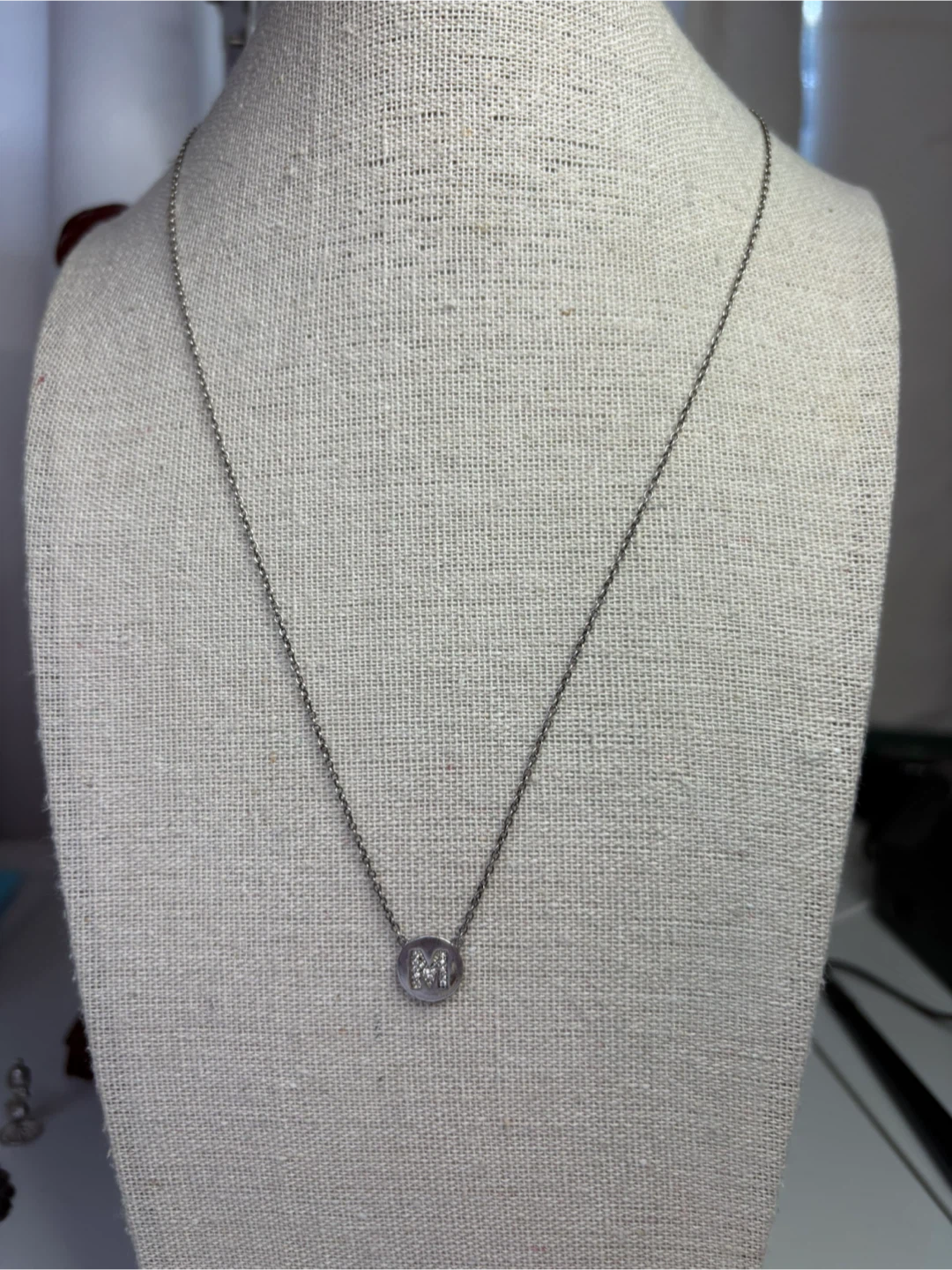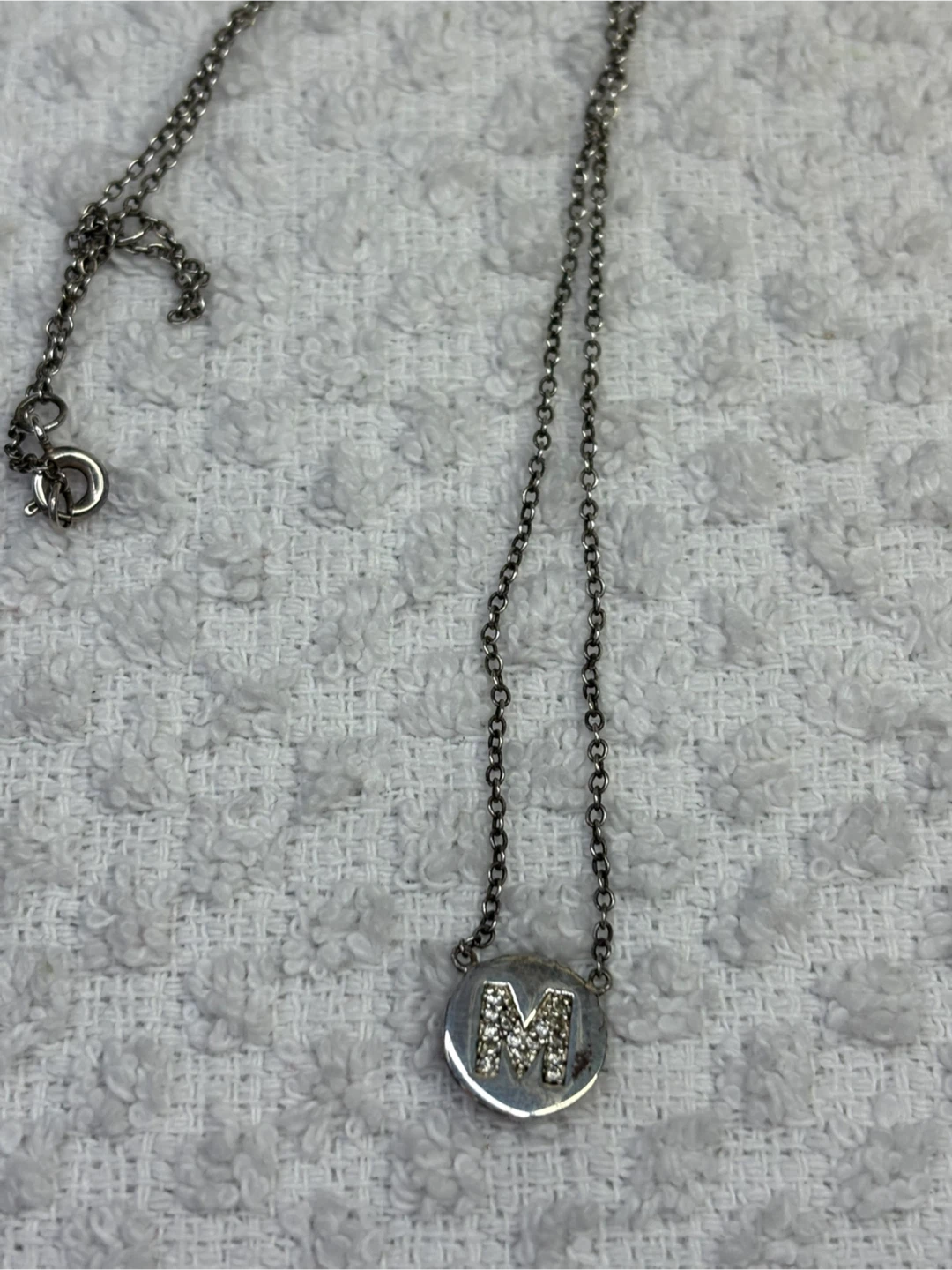 A lovely sterling silver necklace featuring an 'M' initial pendant. It's in great shape and ready to add a personal touch to your style. Spring ring clasp . 16-18 inches long.