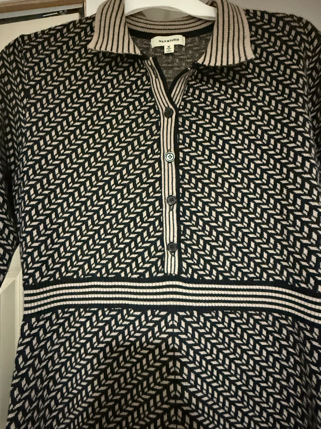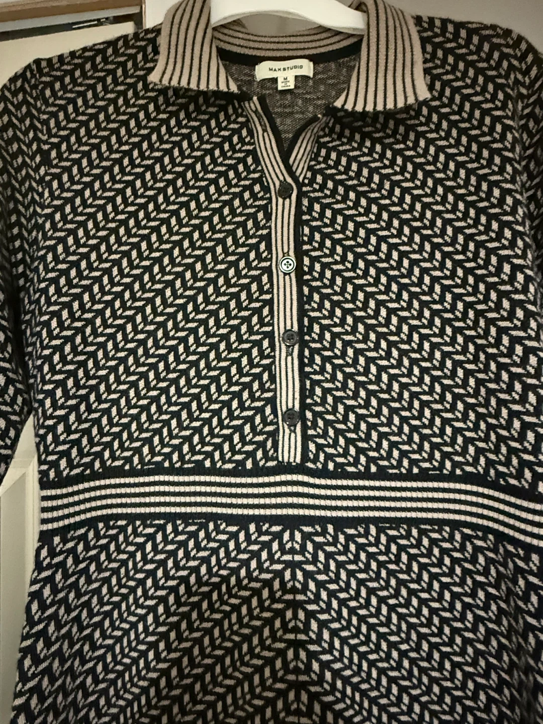 Selling a gently used Max Studio knit dress. It's a size M and features a unique patterned design. Perfect for a casual or semi-formal occasion!
