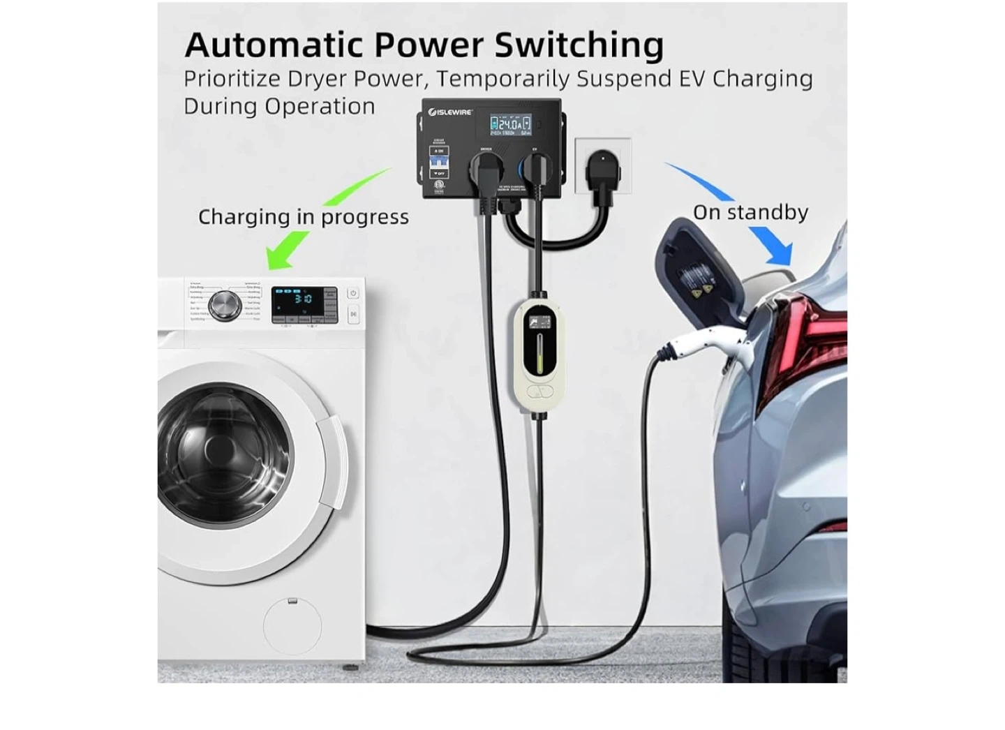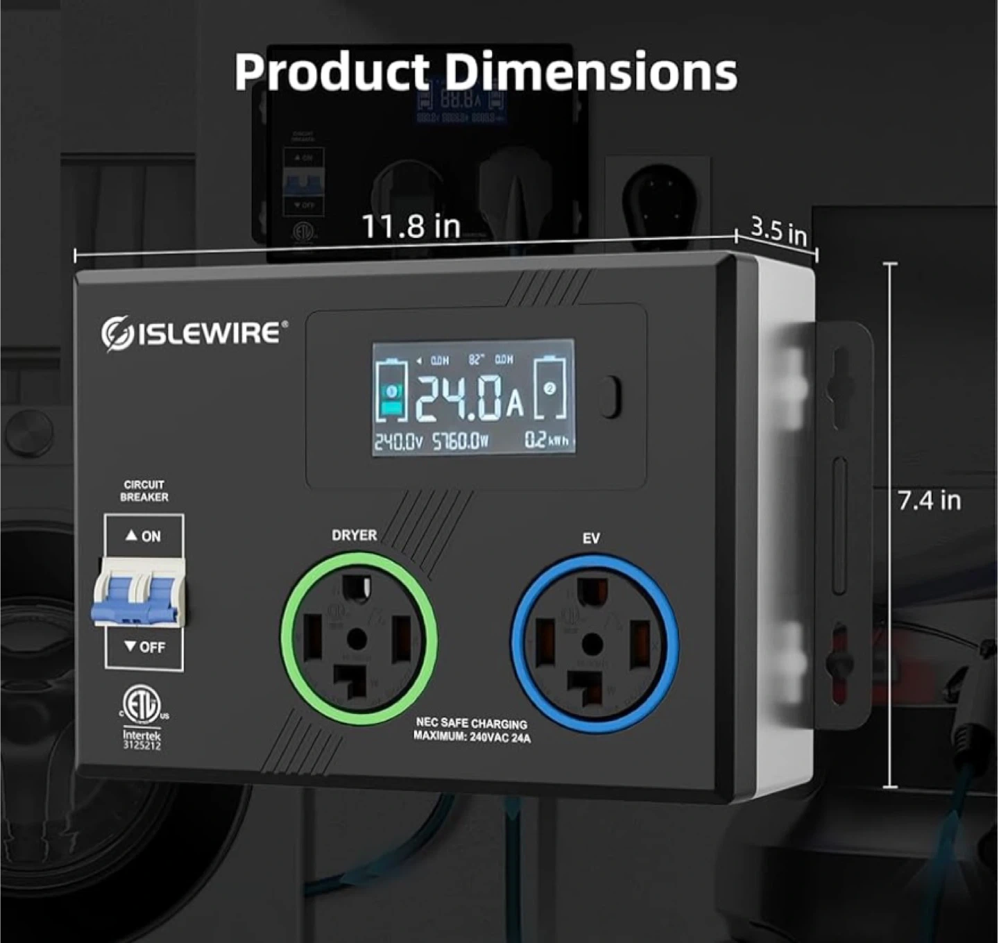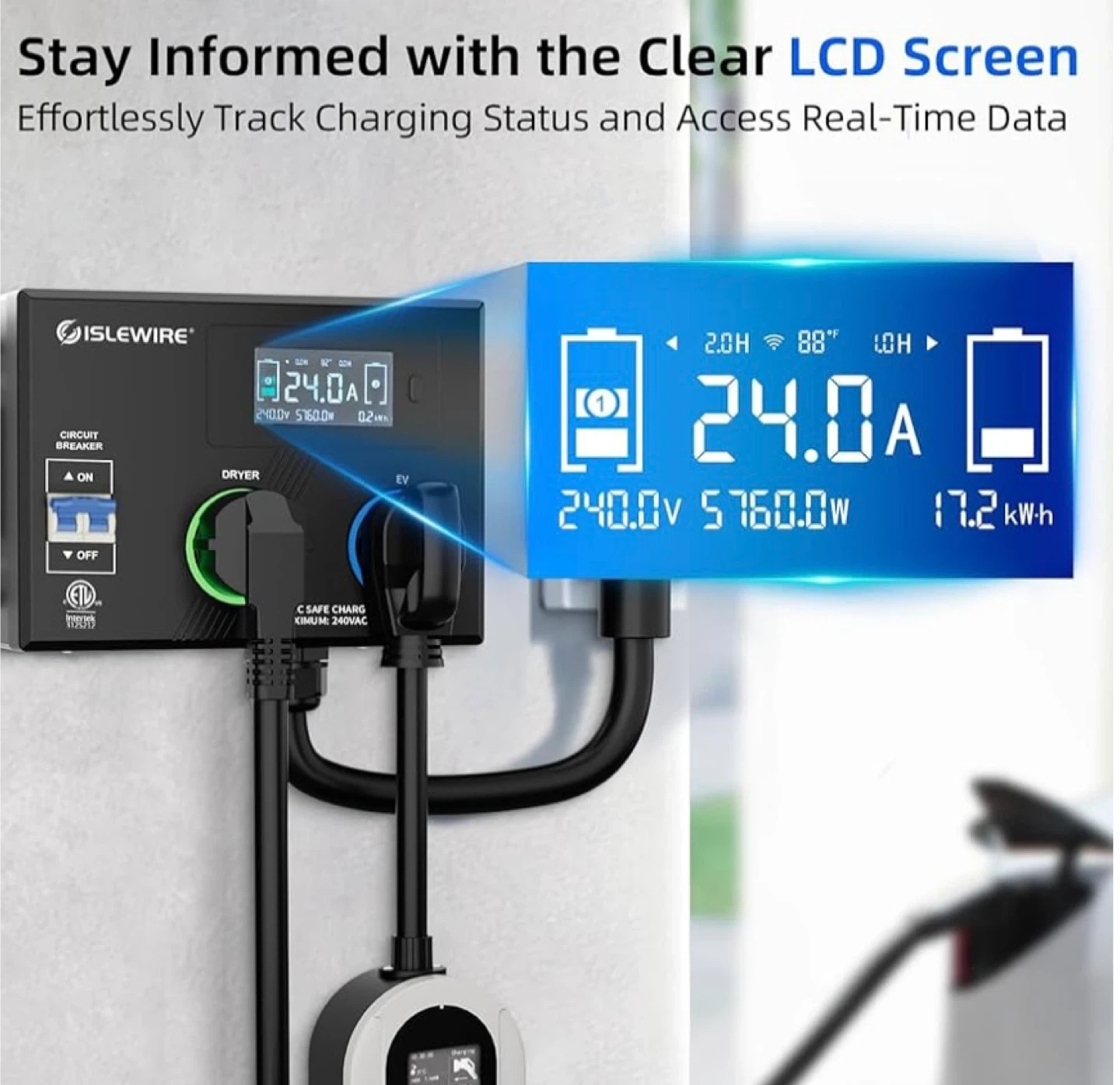 Selling an Islewire EV charger. It features an LCD screen to track charging status and access real-time data. It also has automatic power switching, prioritizing dryer power and temporarily suspending EV charging during operation. Dimensions are 11.8 x 7.4 x 3.5 inches