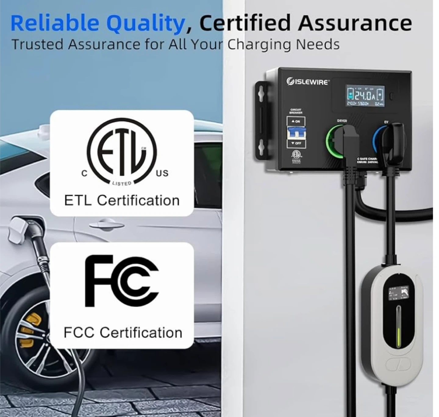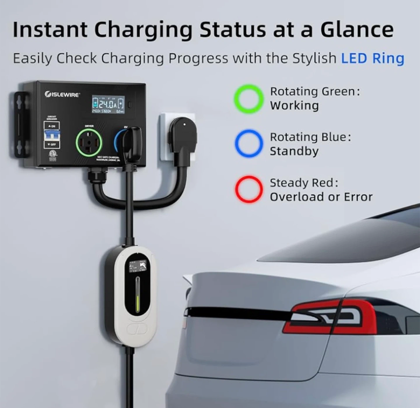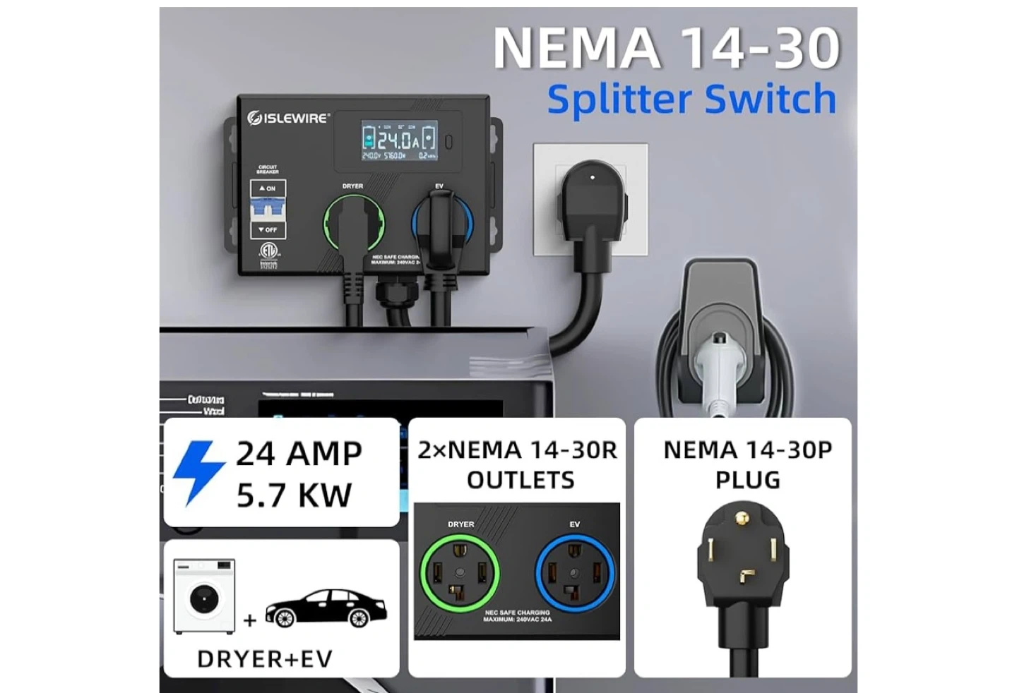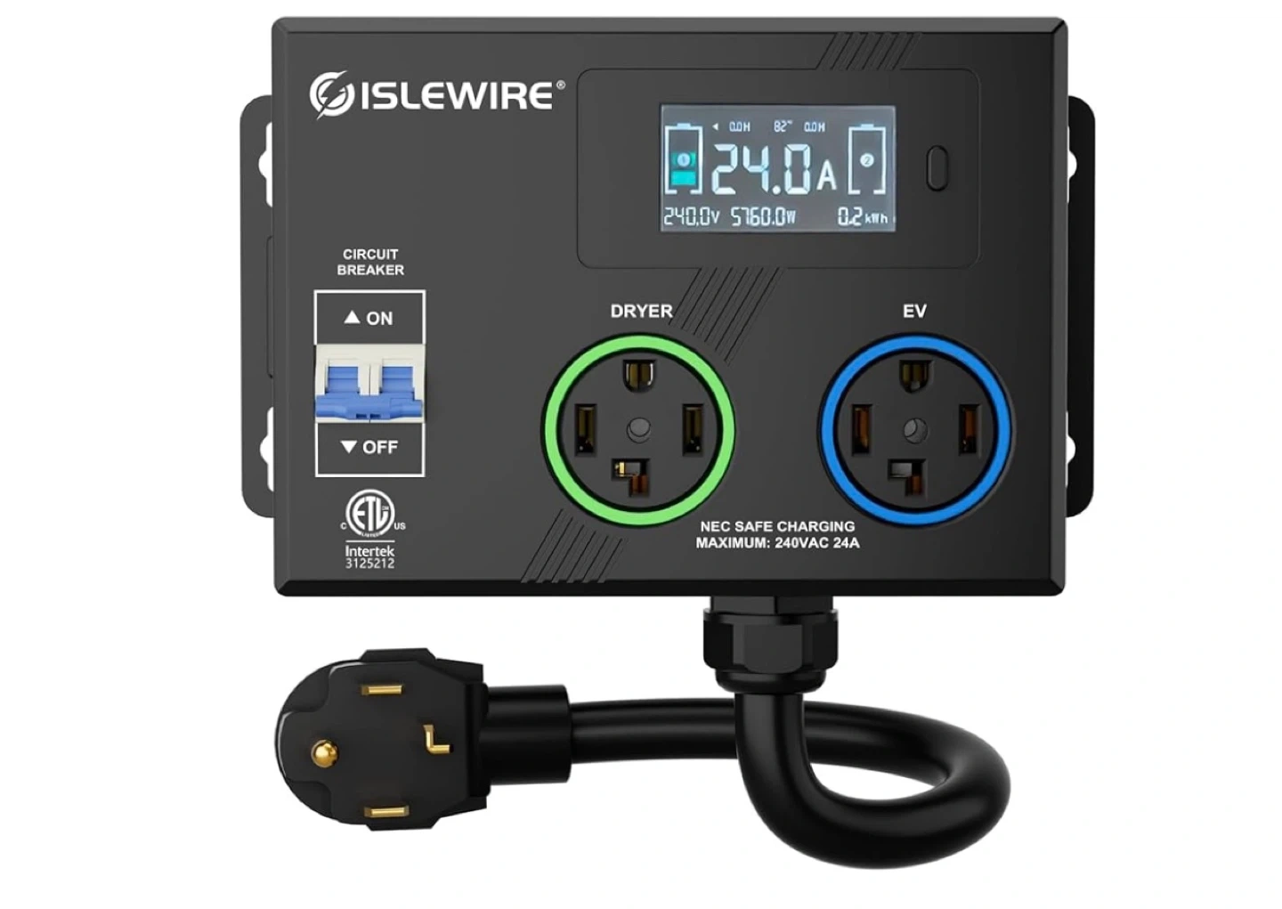Selling an Islewire EV charger. It features an LCD screen to track charging status and access real-time data. It also has automatic power switching, prioritizing dryer power and temporarily suspending EV charging during operation. Dimensions are 11.8 x 7.4 x 3.5 inches