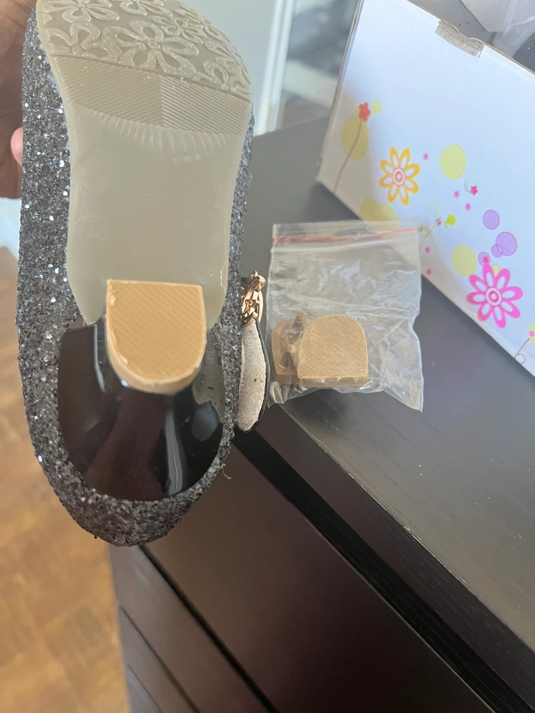 These adorable Jiangyuyan black glitter dress shoes are perfect for your little one! They feature a cute flower design with iridescent accents. They are a size 9 and come with the original box!