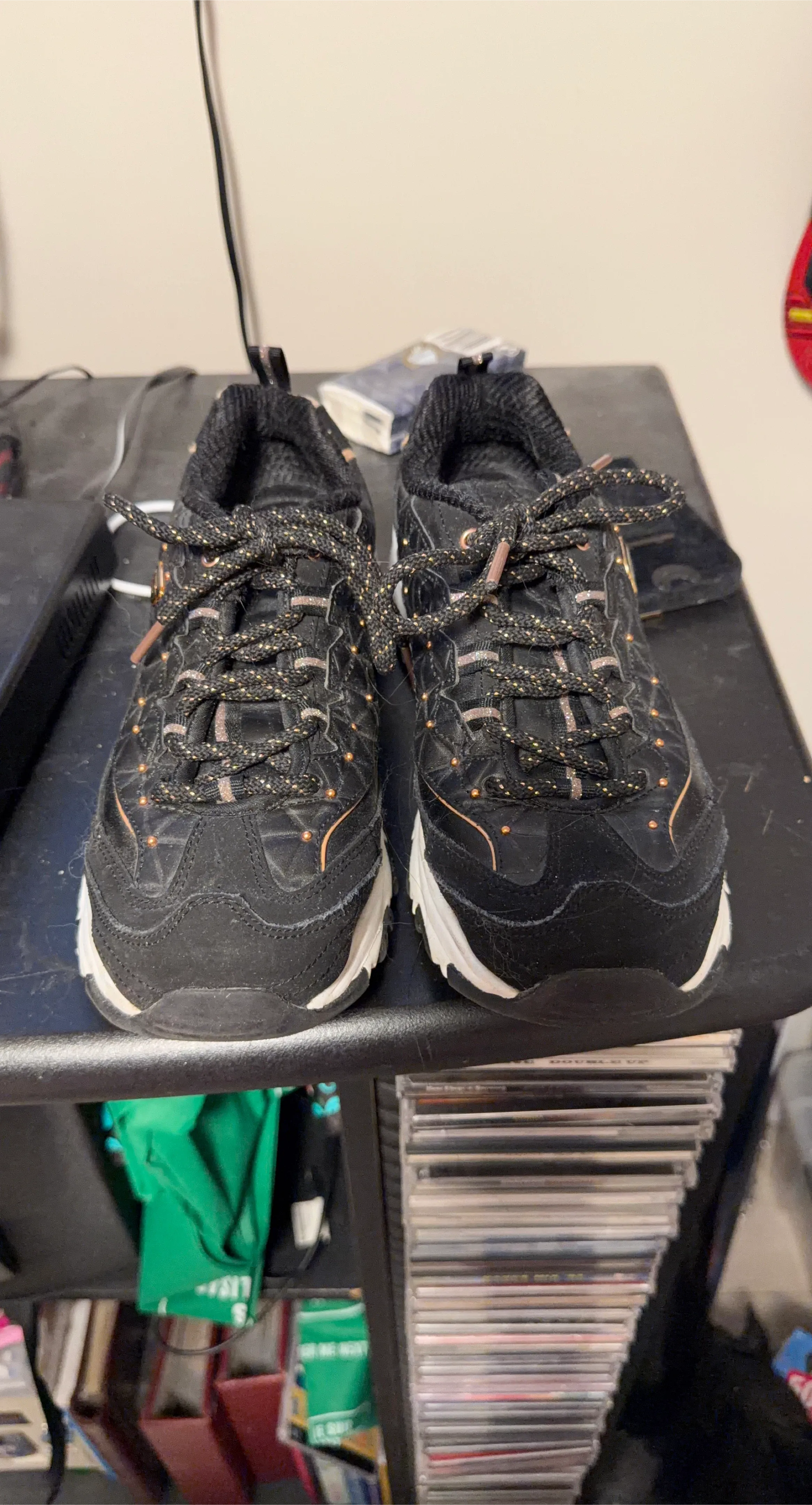 Selling a pair of Skechers D'Lites women's sneakers in black. These feature memory foam insoles for extra comfort. They have a stylish design with unique laces and a chunky sole. Great for everyday wear!
